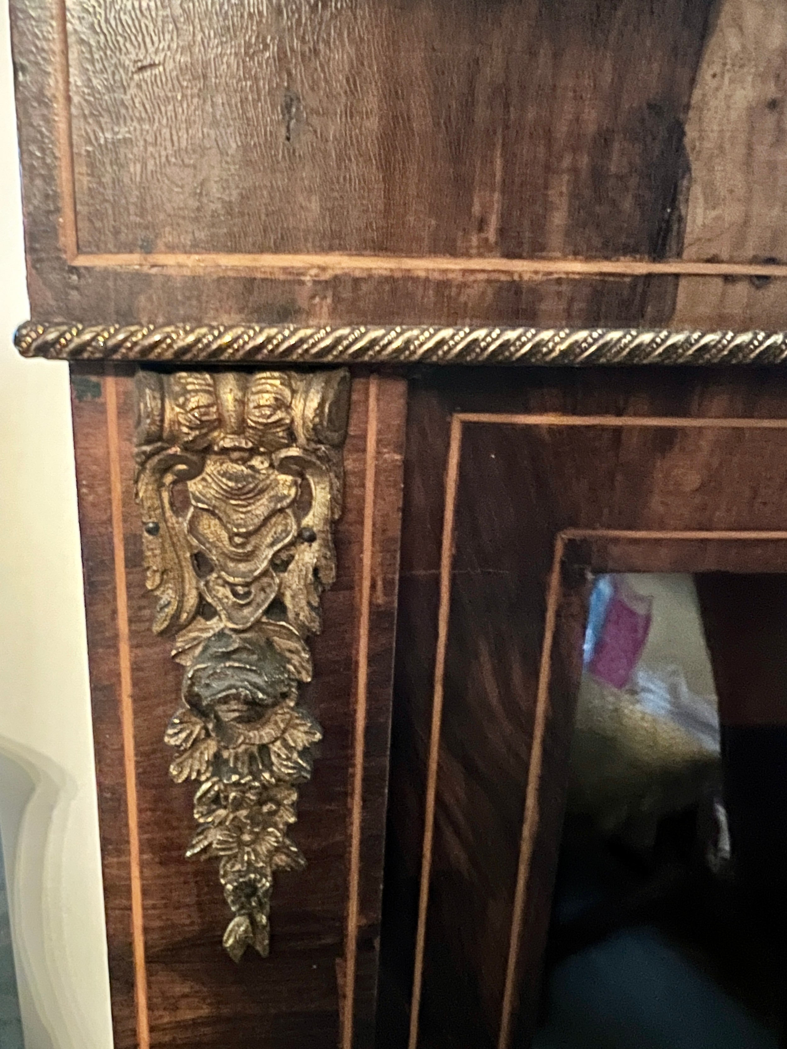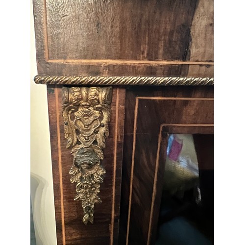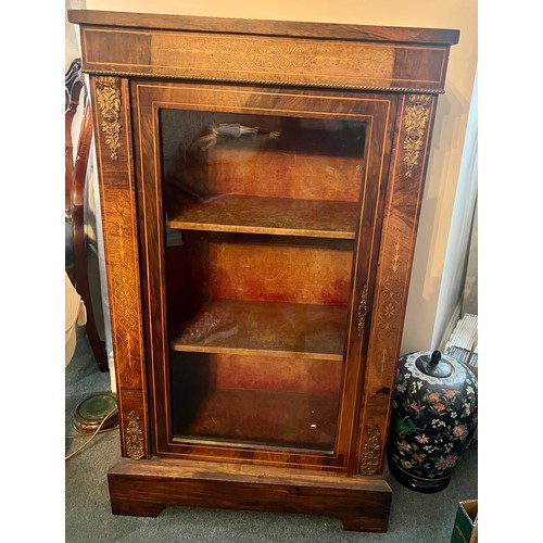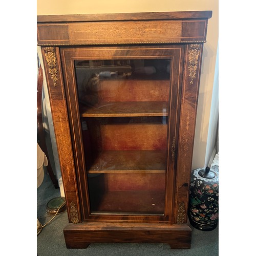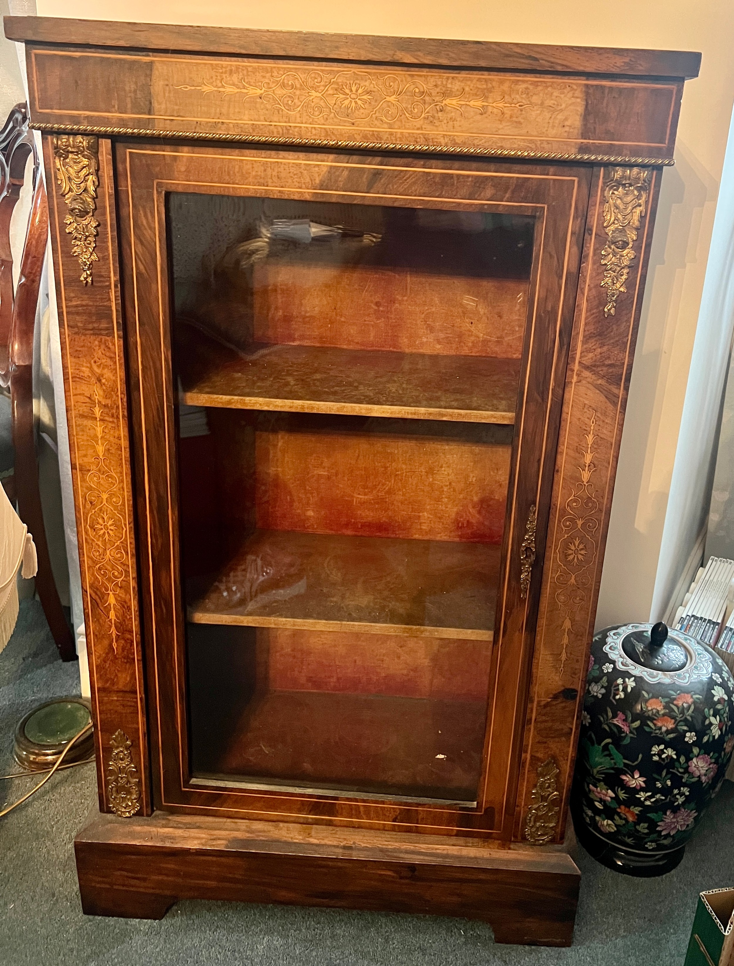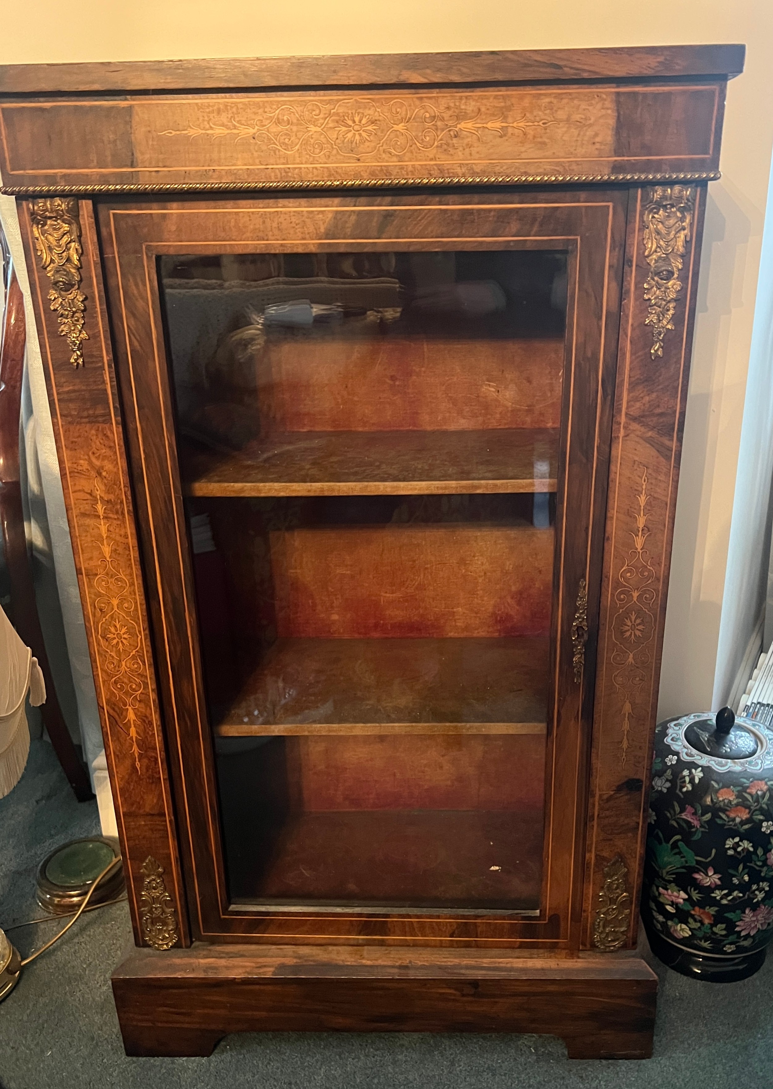 A Victorian walnut and inlaid single door display cabinet with ormolu mounts. 60cm w x 32cm d x 102cm h.