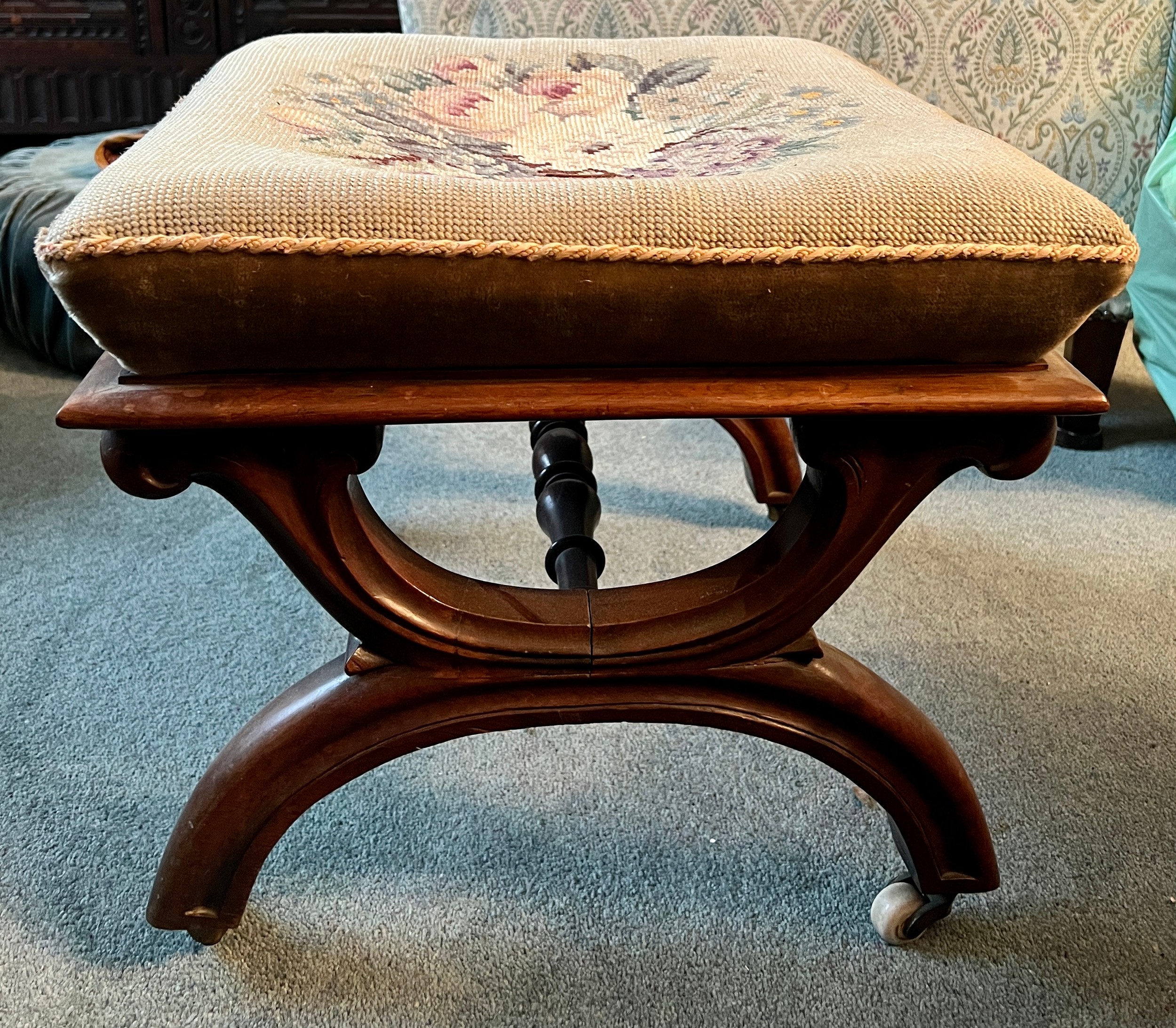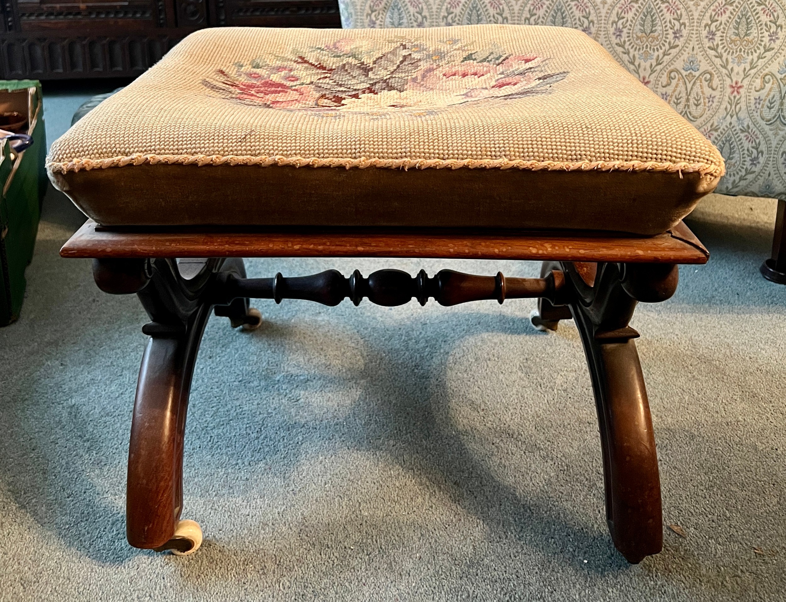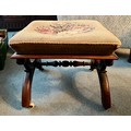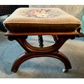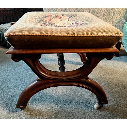 A mid 19thC mahogany X stretchered stool on white porcelain castors with wool work covered top. 47cm x 44cm x 39cm h.