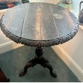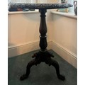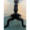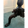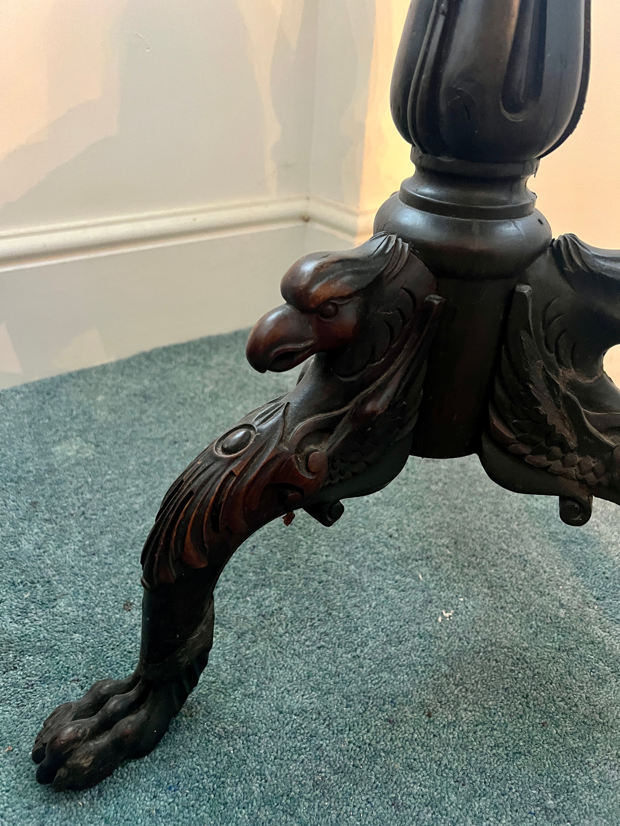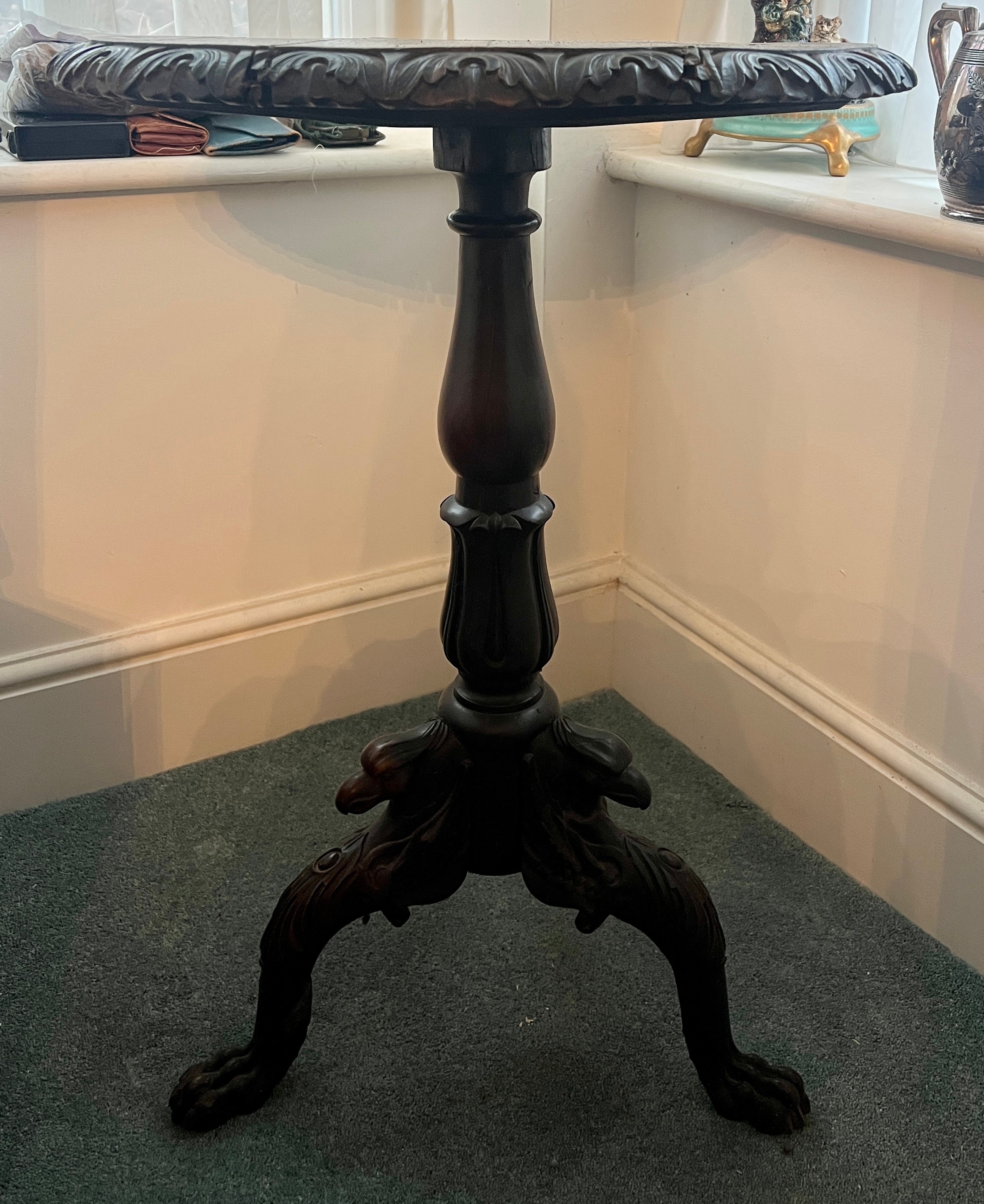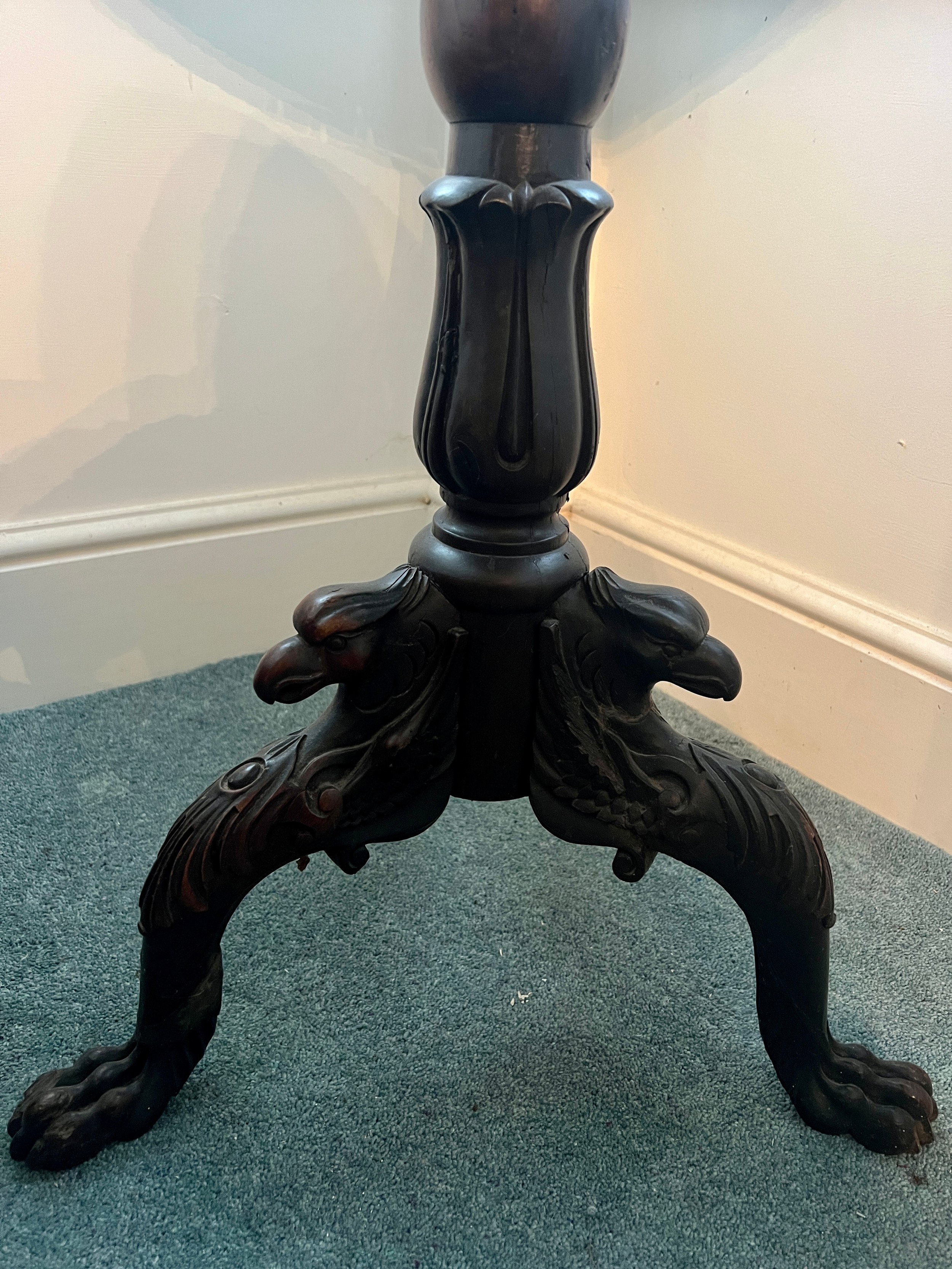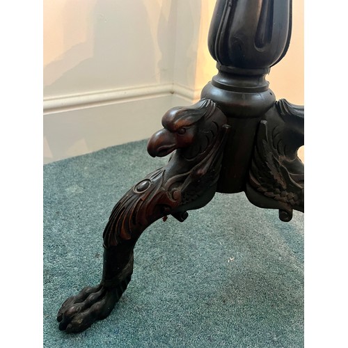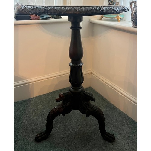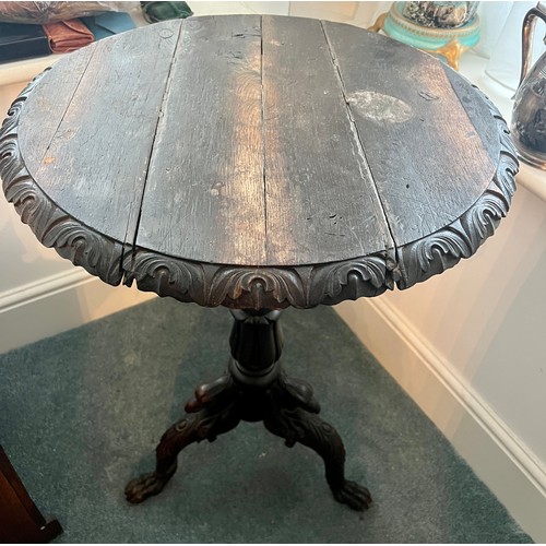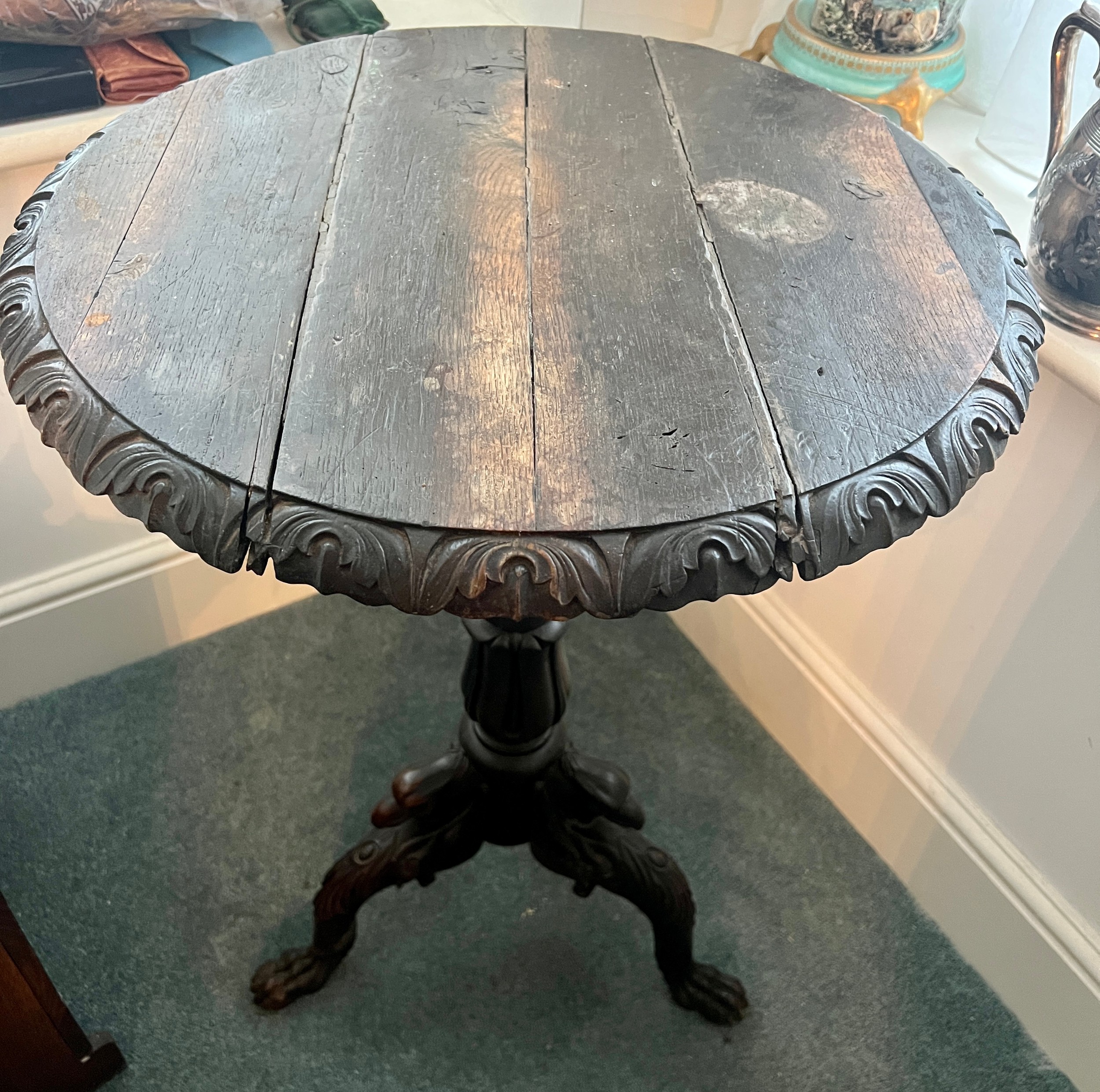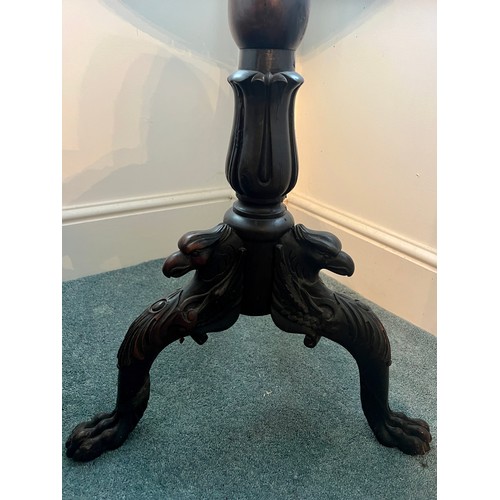 A continental oak tripod table with carved griffin heads and paw feet to base. 53cm d x 75cm h.