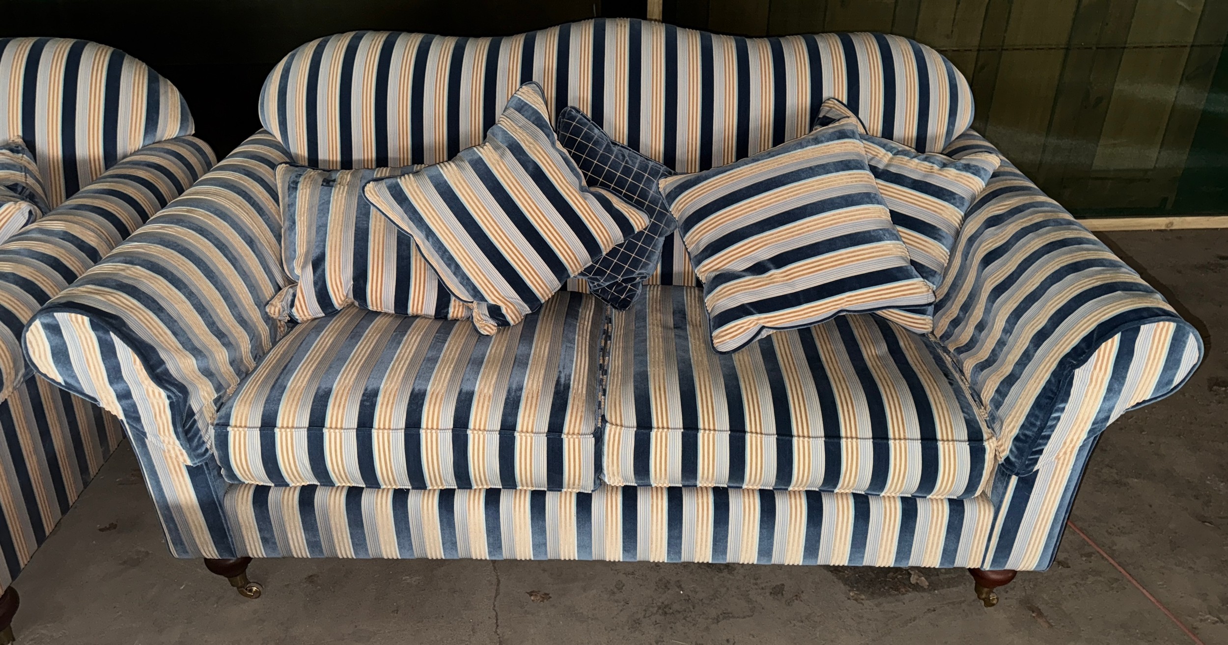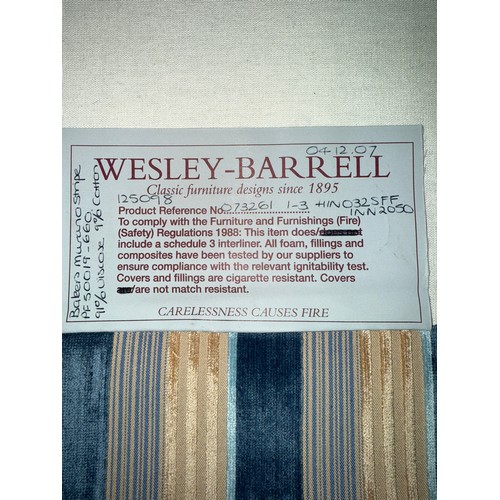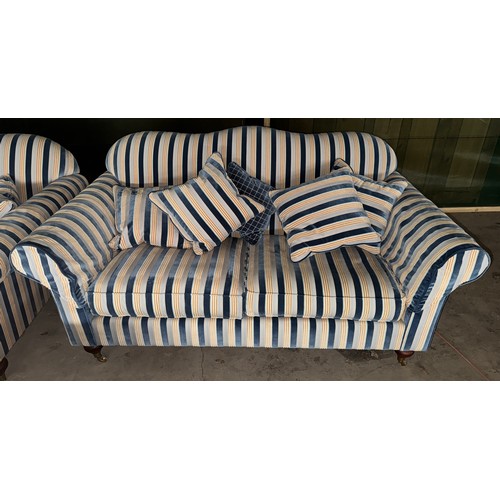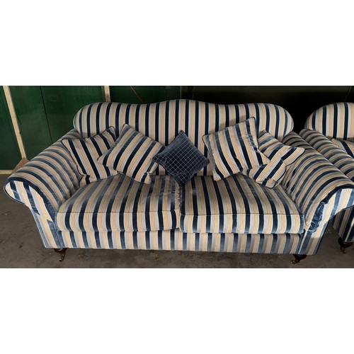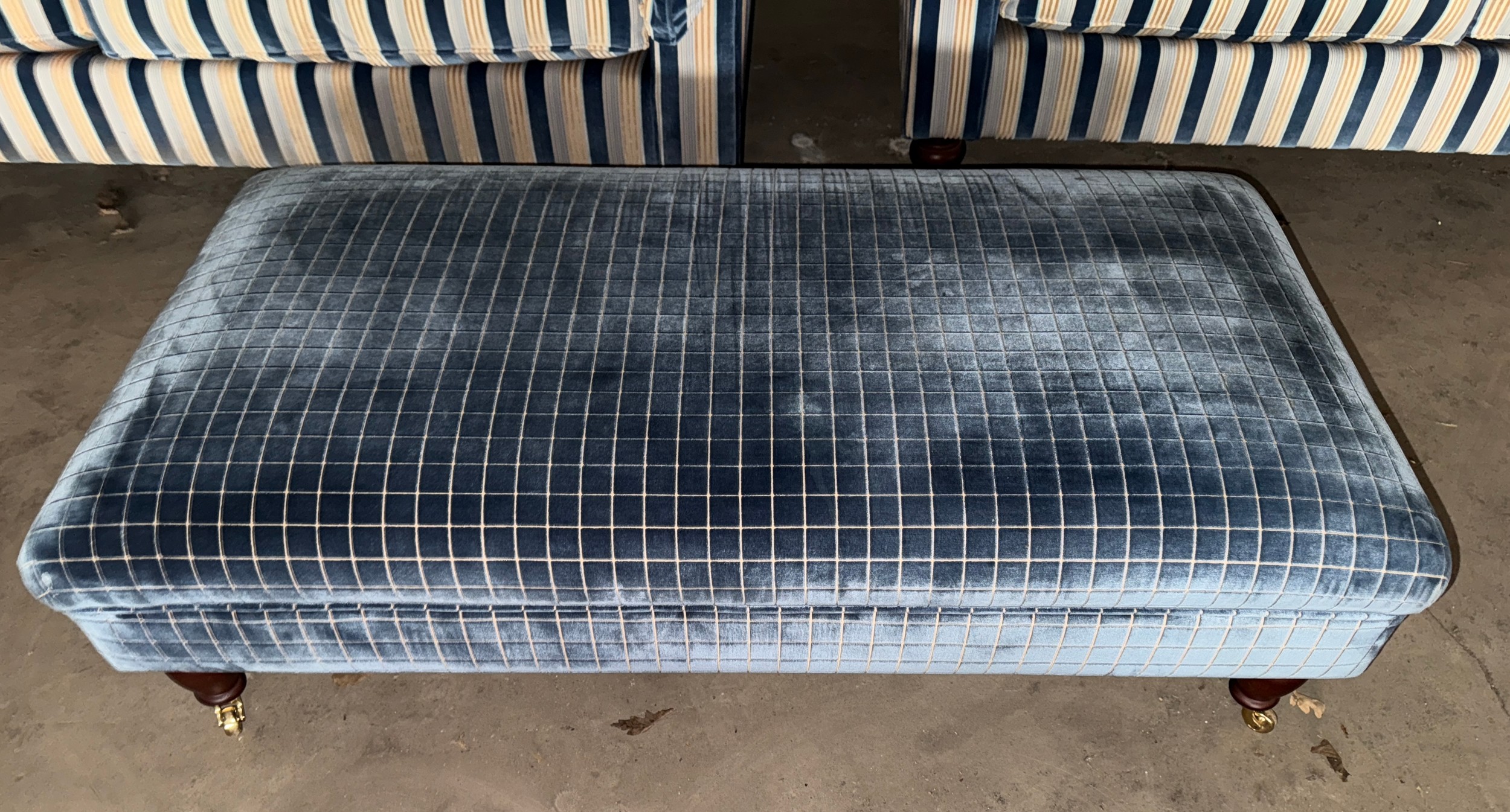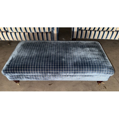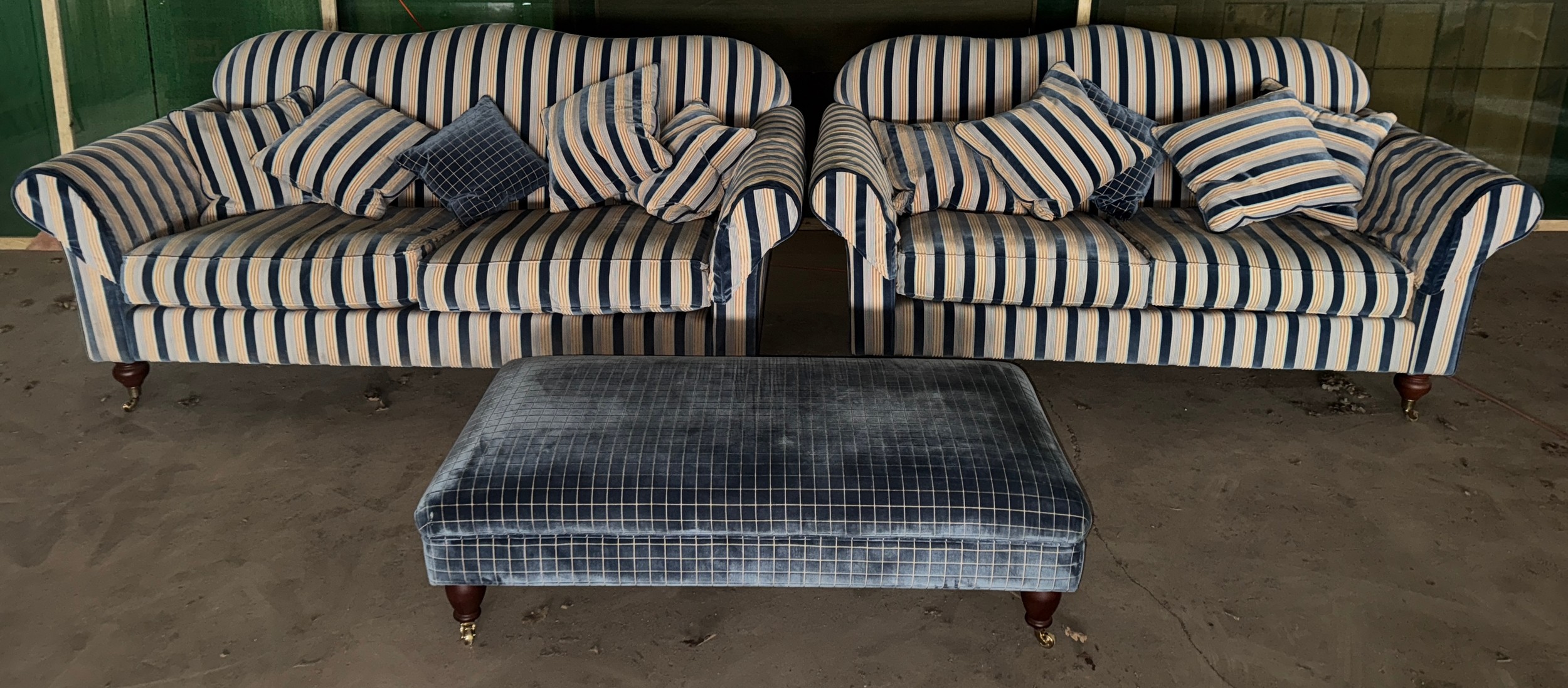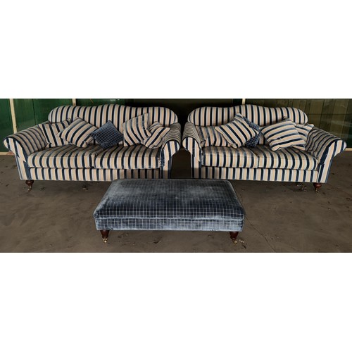 Two two seater Wesley Barrell sofas on brass castors and a Wesley Barrell footstool. Sofas 202cm w x 100cm d x 94cm h and 181cm w x 92cm d x 94cm h. Footstool 123cm w x 65cm d x 37cm h.