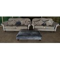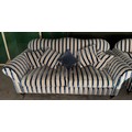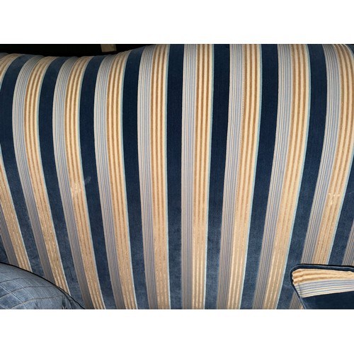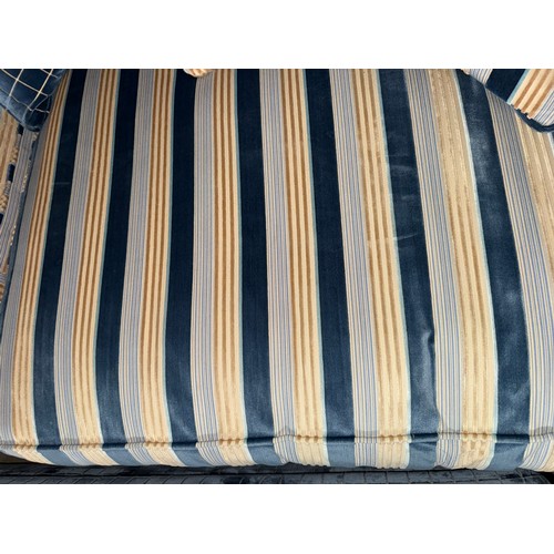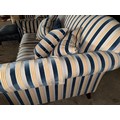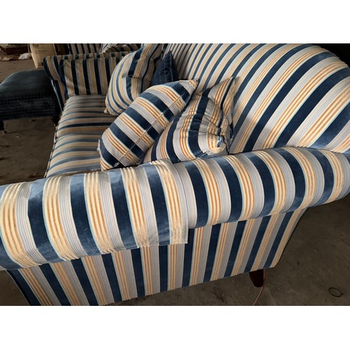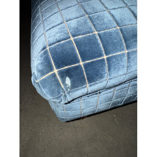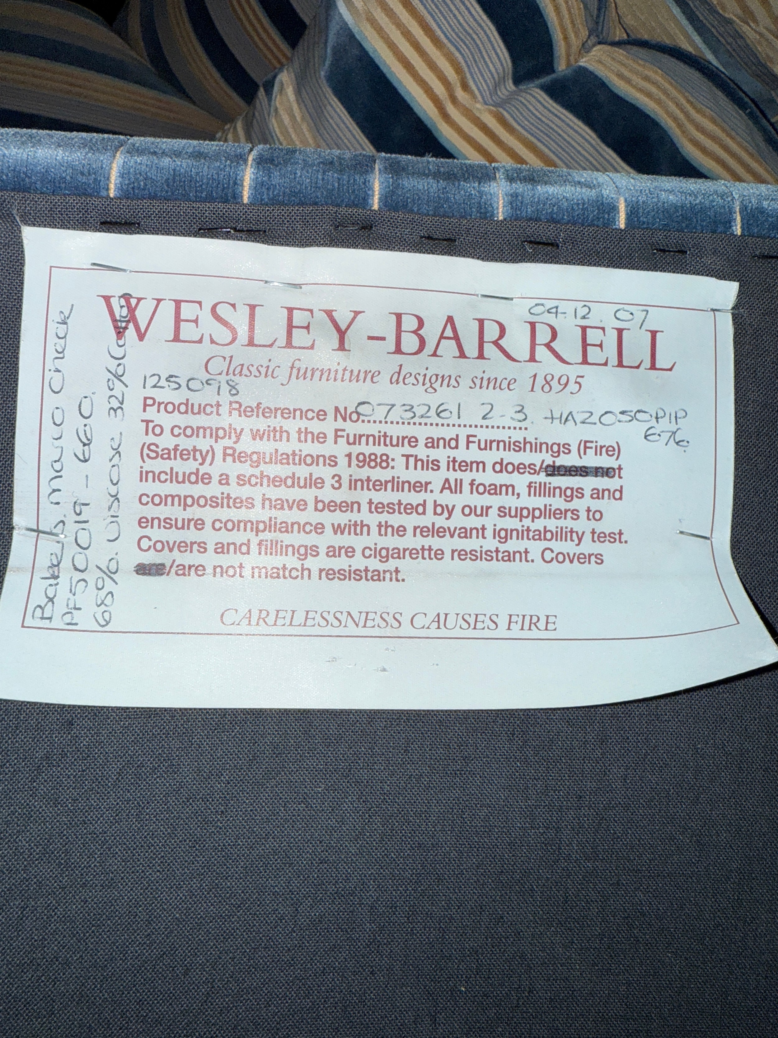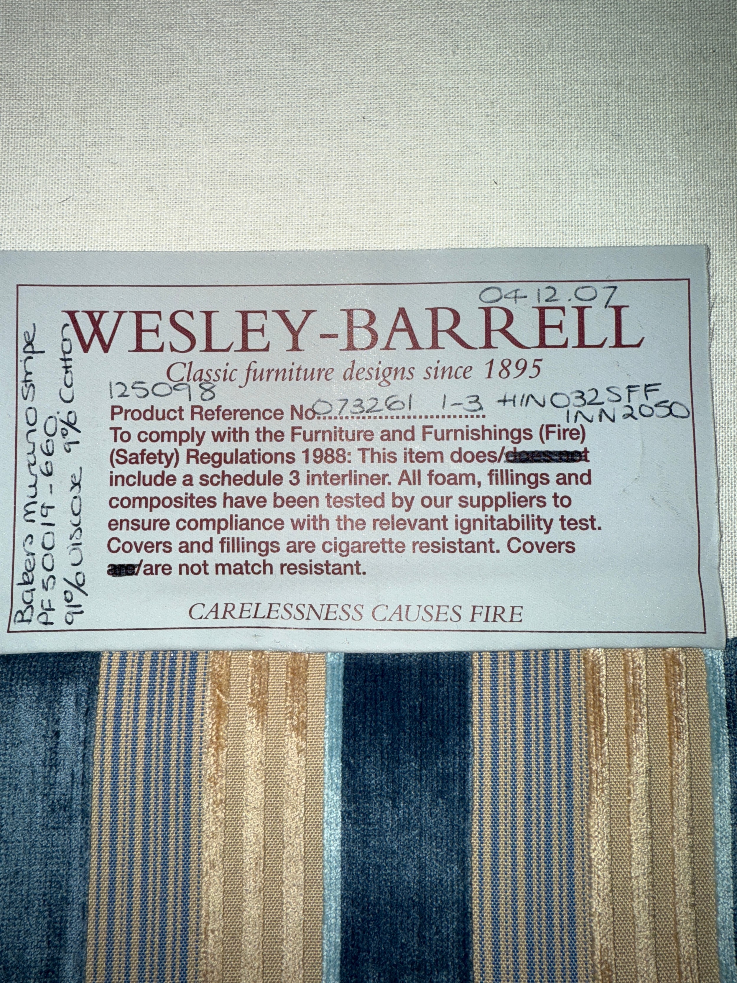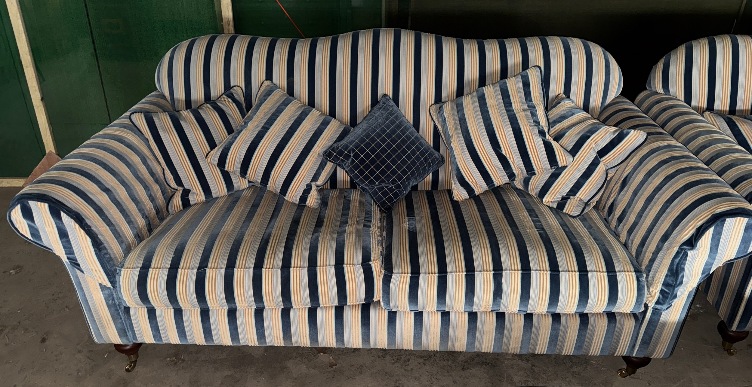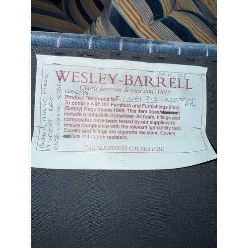 Two two seater Wesley Barrell sofas on brass castors and a Wesley Barrell footstool. Sofas 202cm w x 100cm d x 94cm h and 181cm w x 92cm d x 94cm h. Footstool 123cm w x 65cm d x 37cm h.