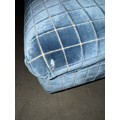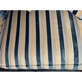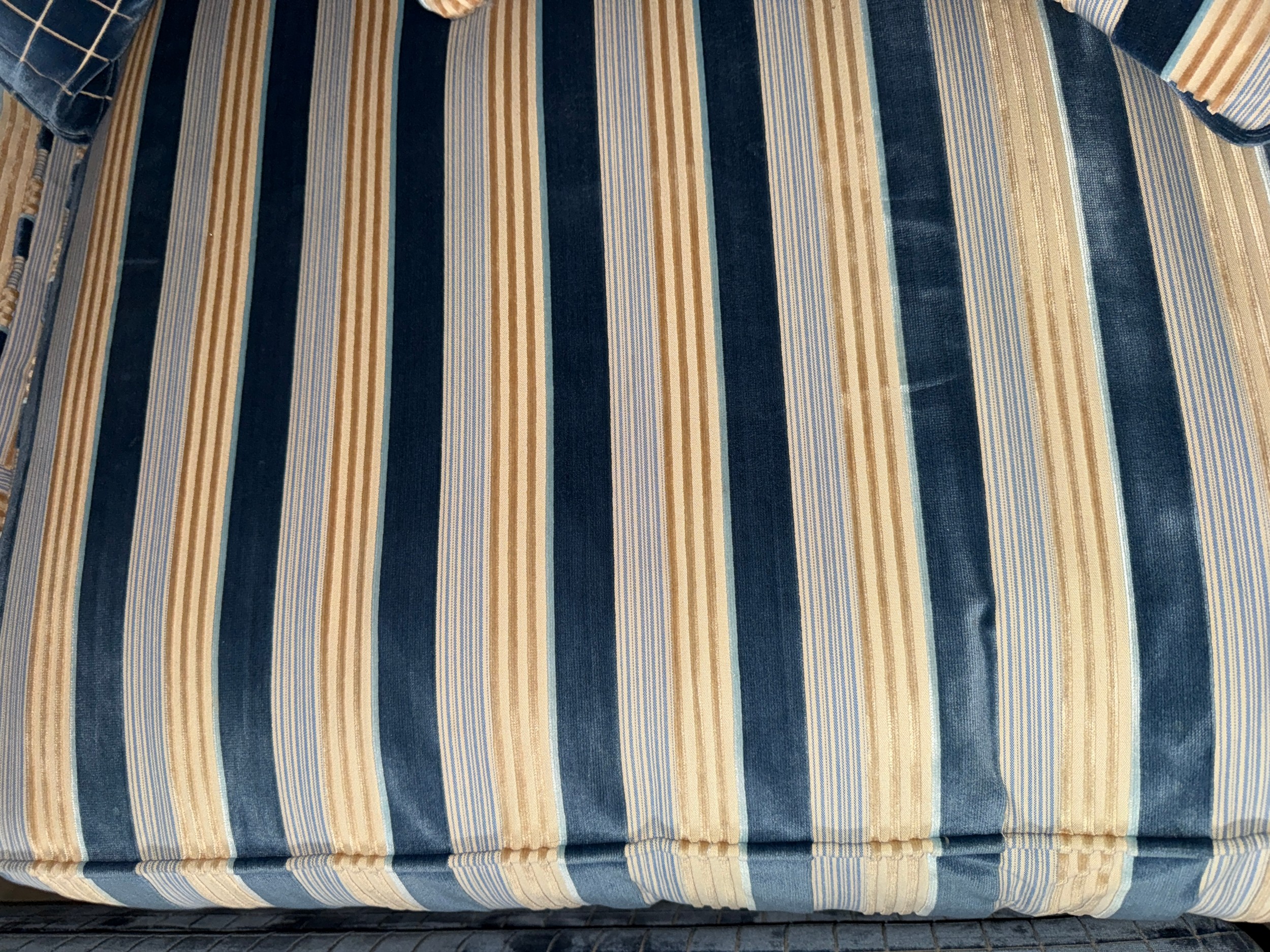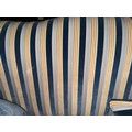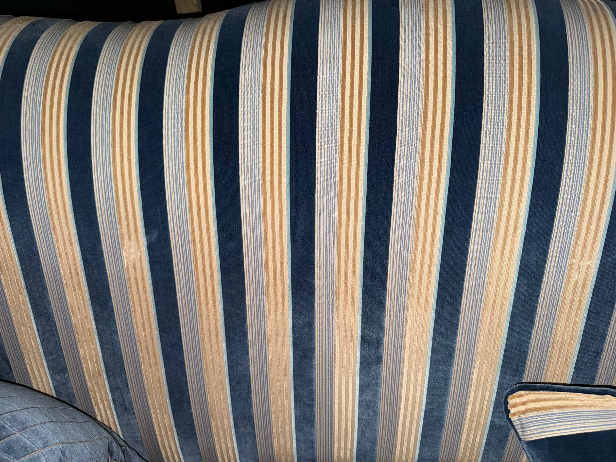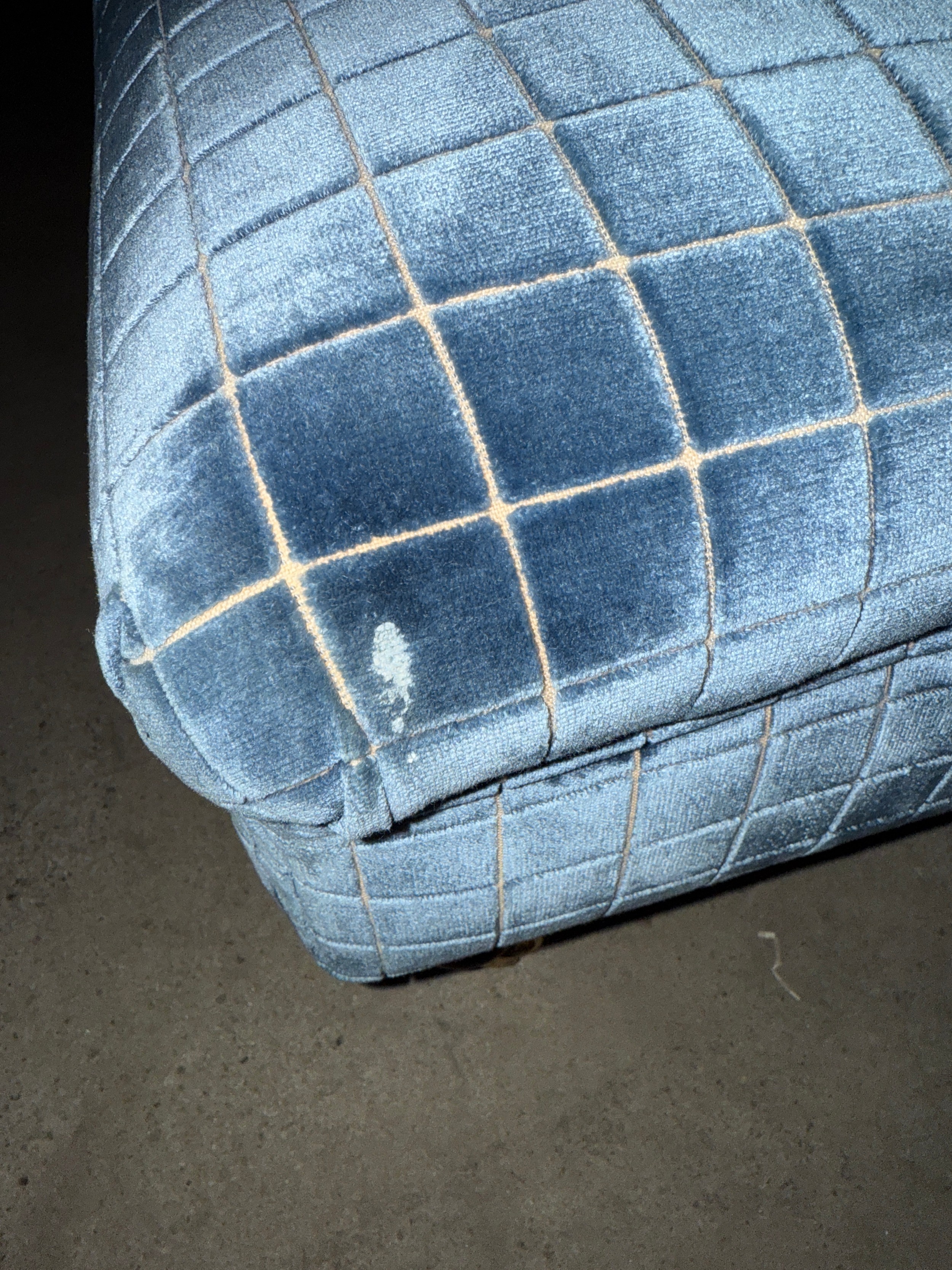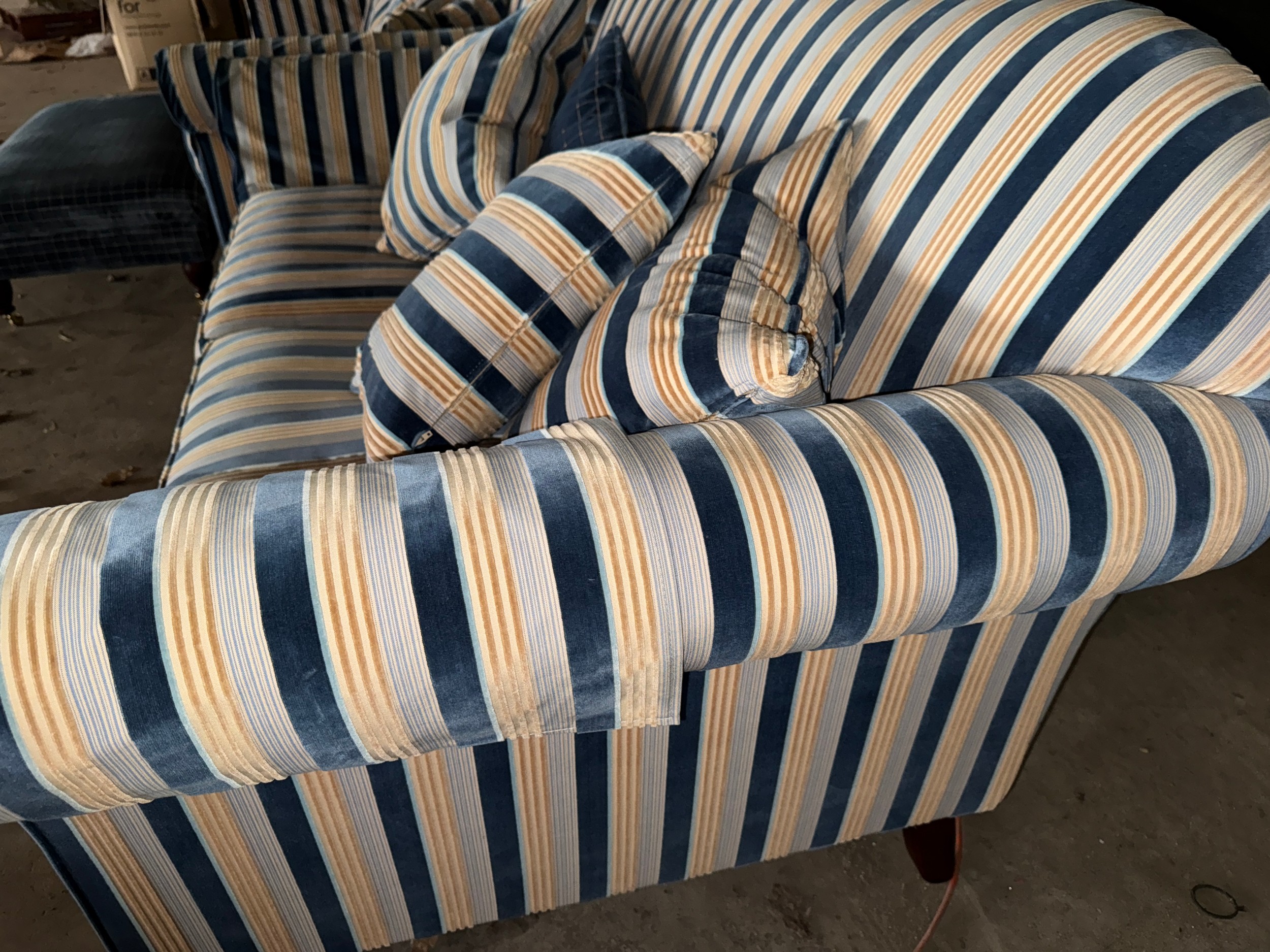 Two two seater Wesley Barrell sofas on brass castors and a Wesley Barrell footstool. Sofas 202cm w x 100cm d x 94cm h and 181cm w x 92cm d x 94cm h. Footstool 123cm w x 65cm d x 37cm h.