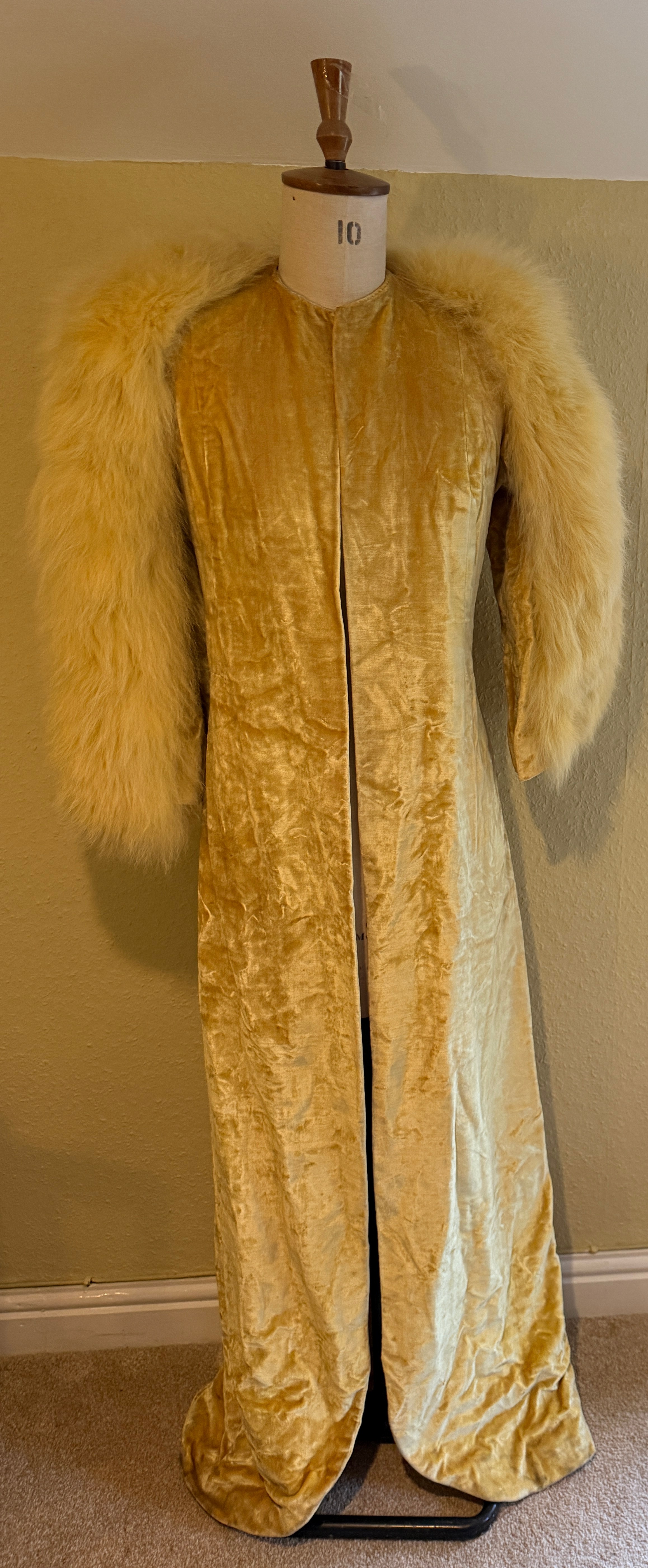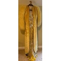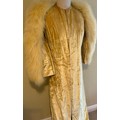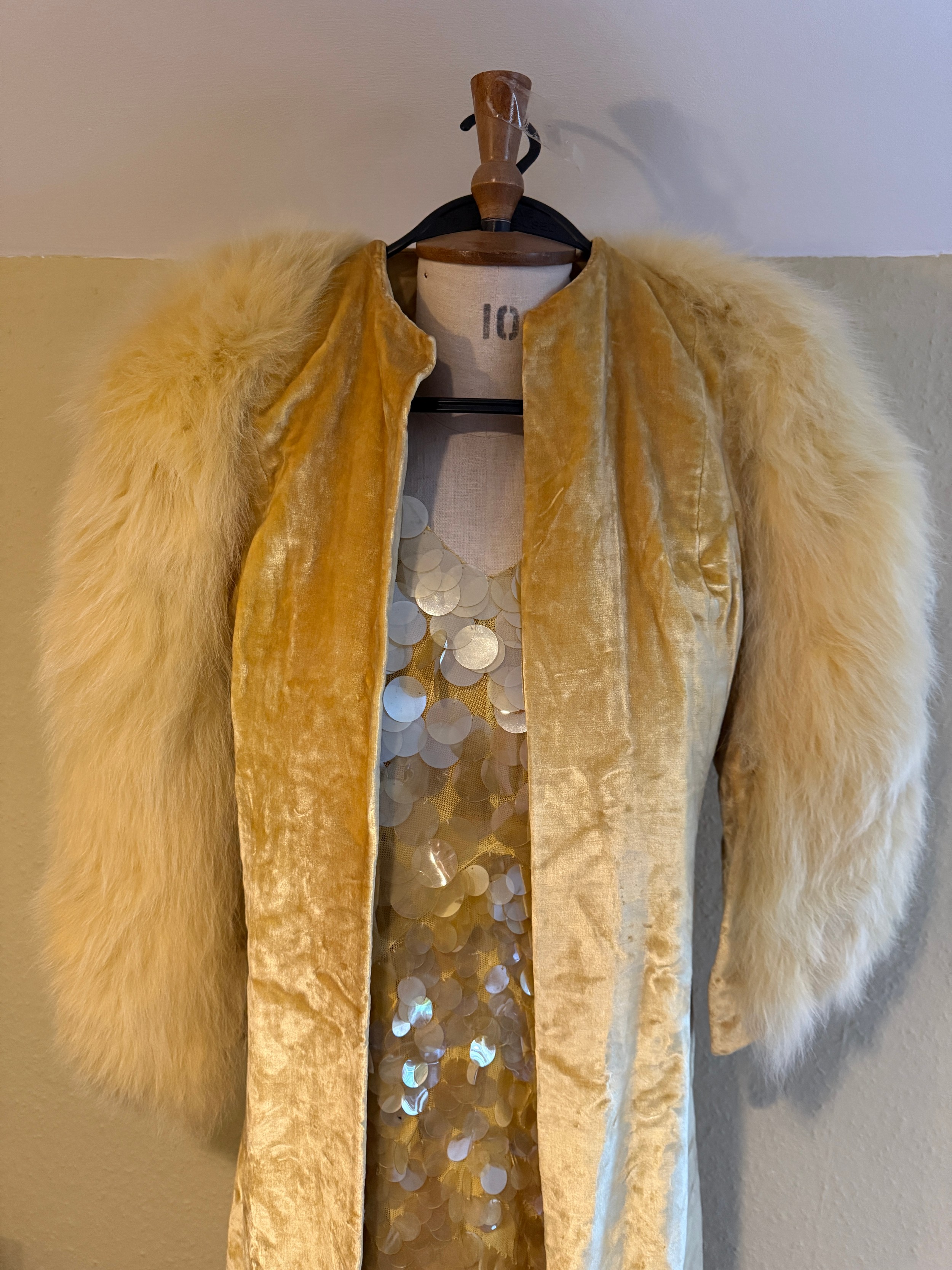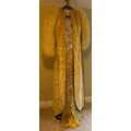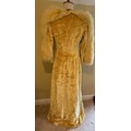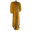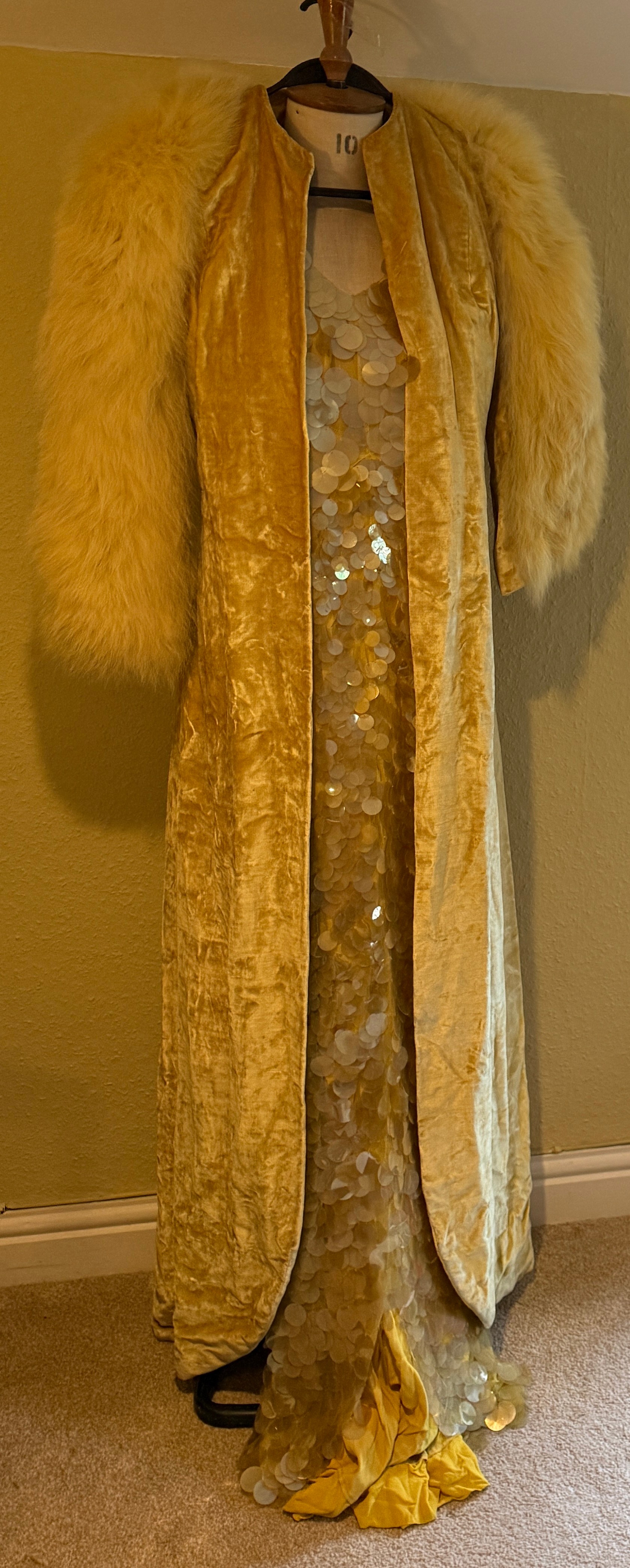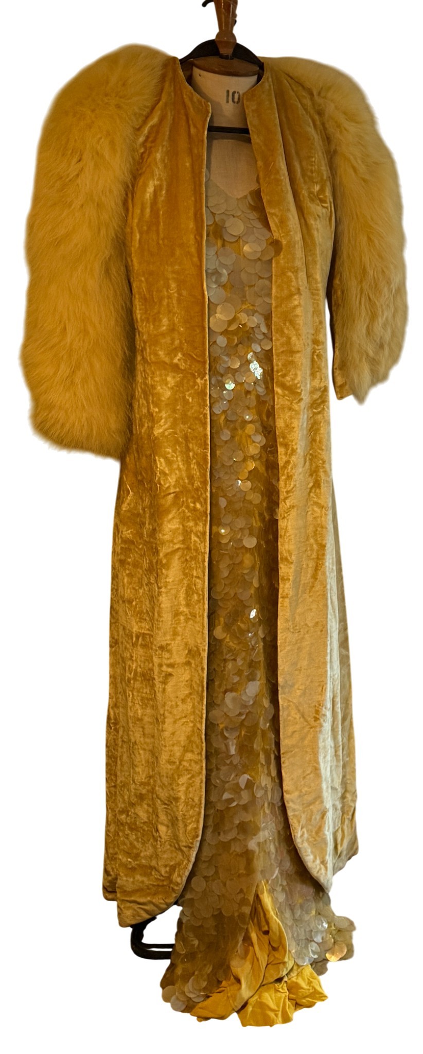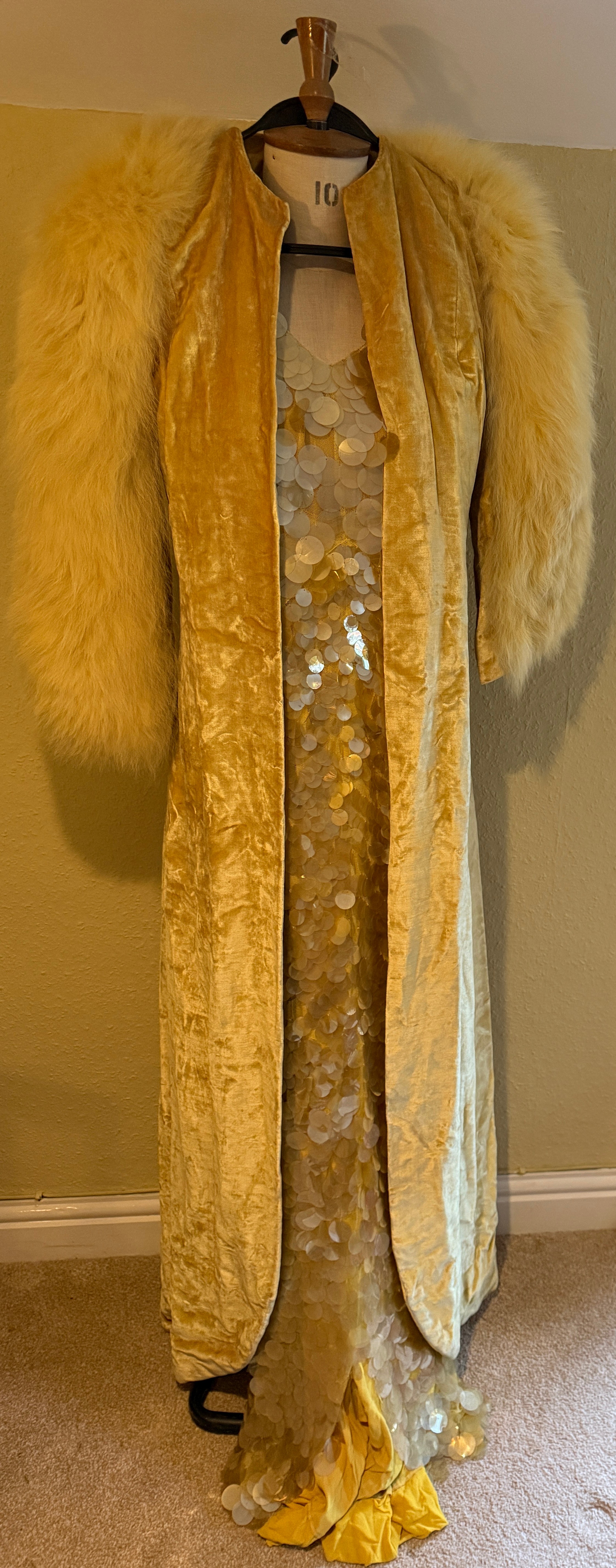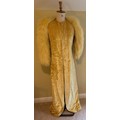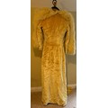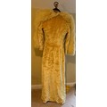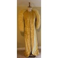 A 1930's Peter Russell canary yellow sequinned bias cut dress of cotton tulle over a silk crepe bias cut slip with silk chiffon bodice and shoestring straps, bust 32cms flat. This comes with a Peter Russell yellow silk velvet evening coat adorned with fox fur to both shoulders and sleeves, neck to hem 153cm, underarm to underarm approx. 44cms when flat.