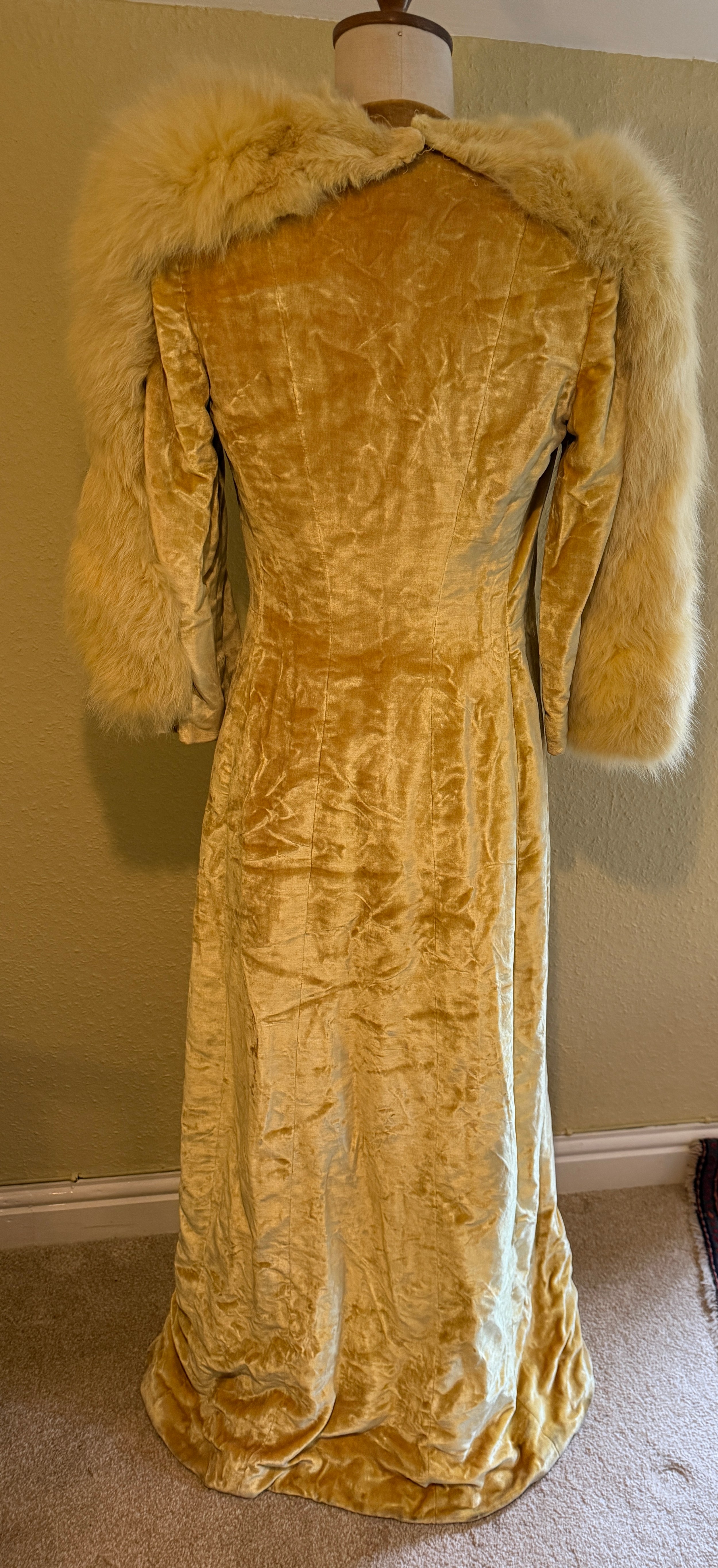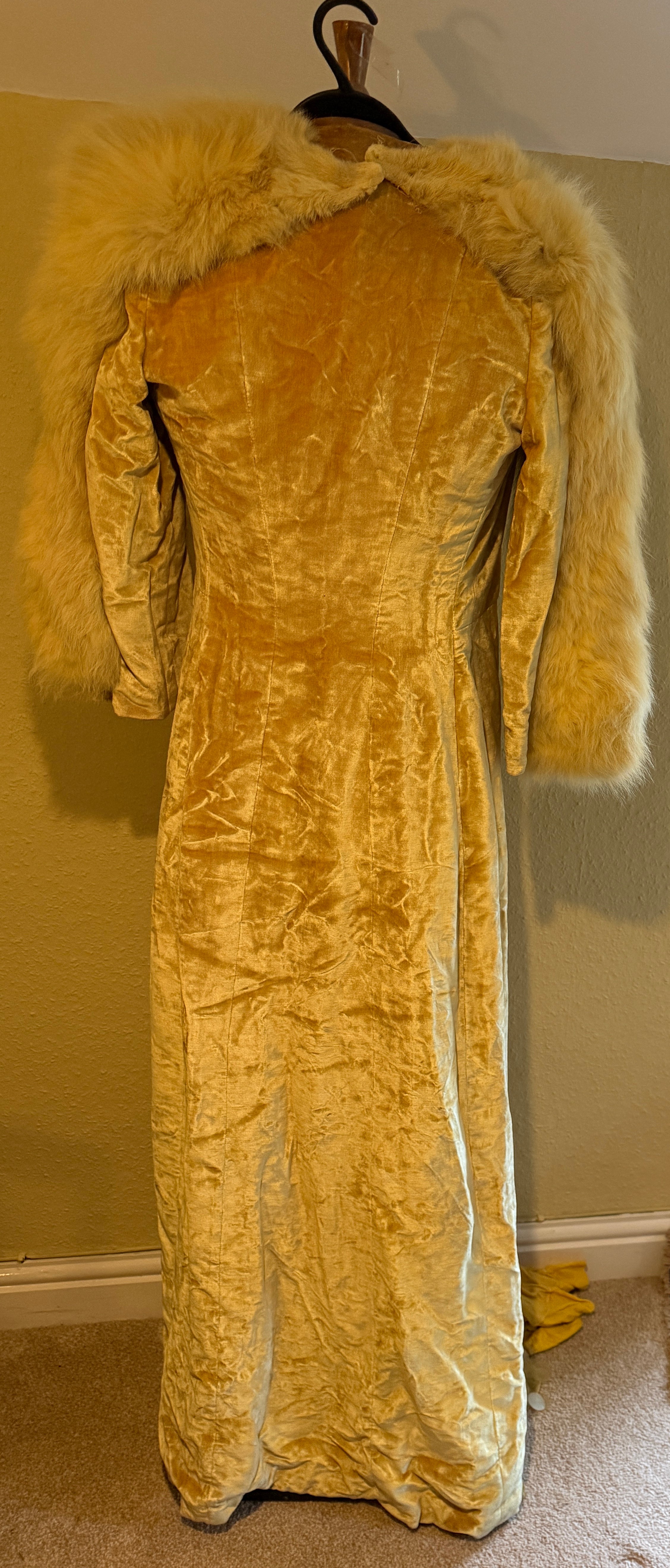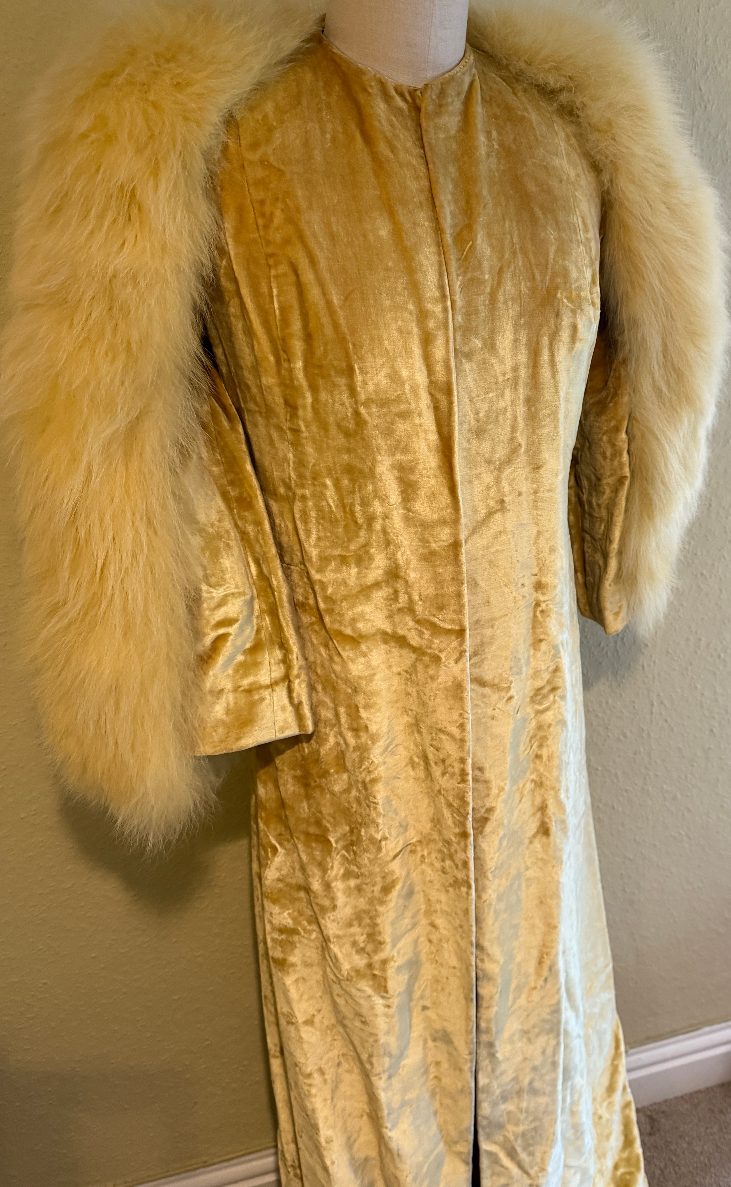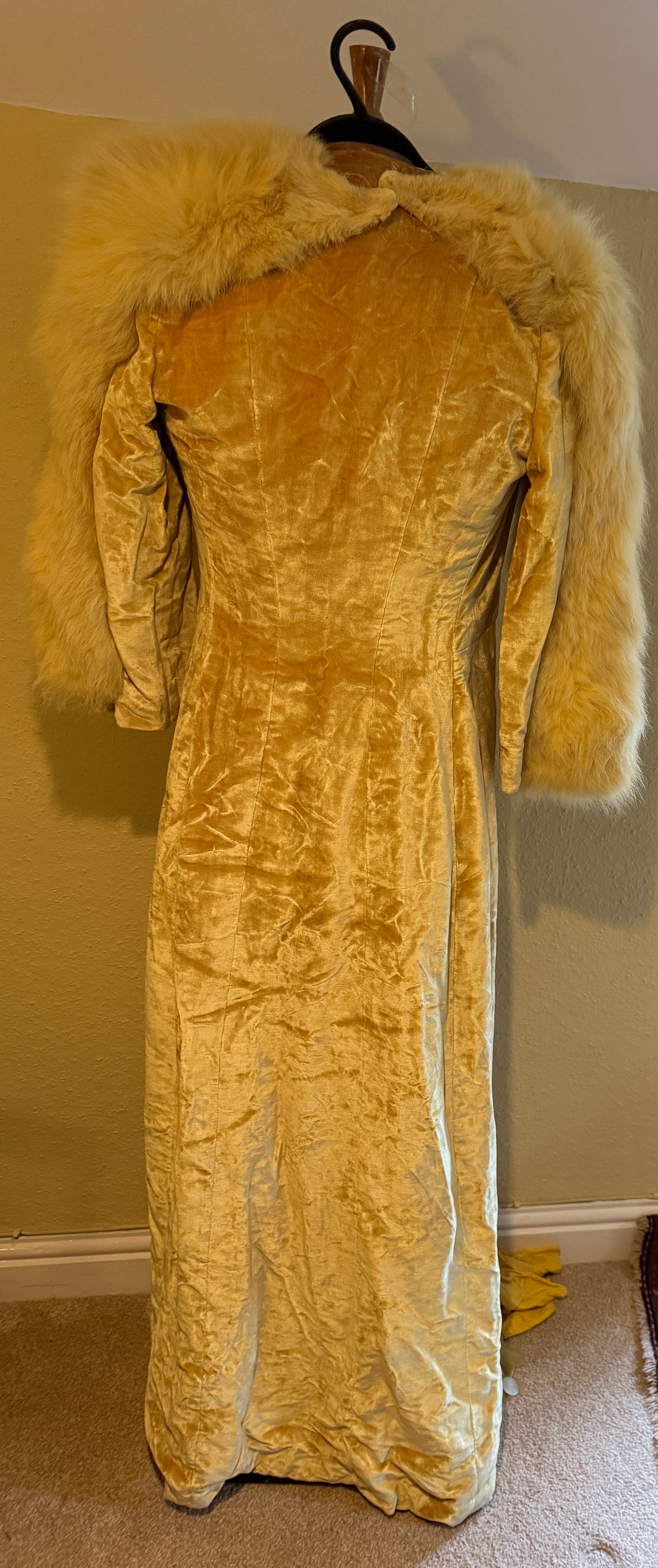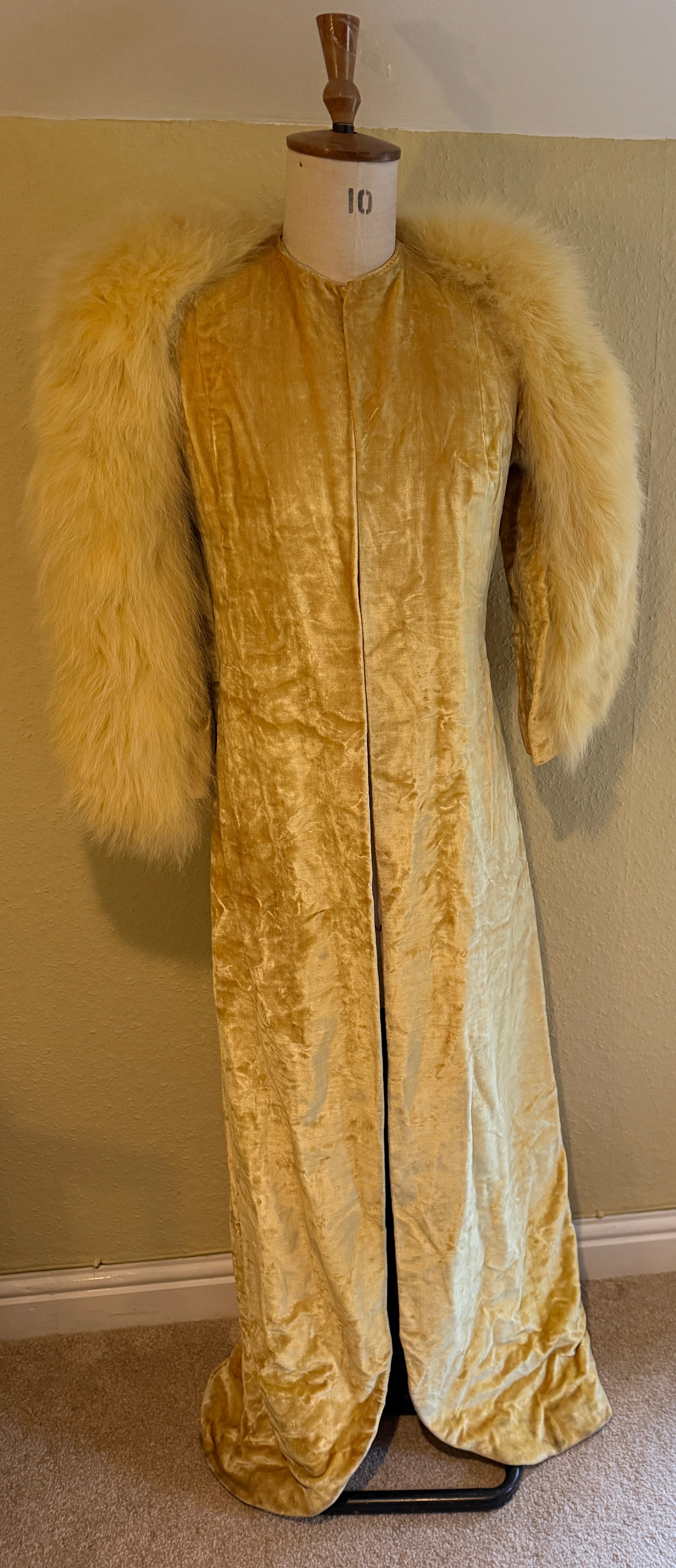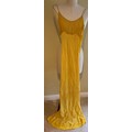 A 1930's Peter Russell canary yellow sequinned bias cut dress of cotton tulle over a silk crepe bias cut slip with silk chiffon bodice and shoestring straps, bust 32cms flat. This comes with a Peter Russell yellow silk velvet evening coat adorned with fox fur to both shoulders and sleeves, neck to hem 153cm, underarm to underarm approx. 44cms when flat.