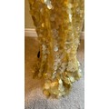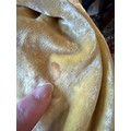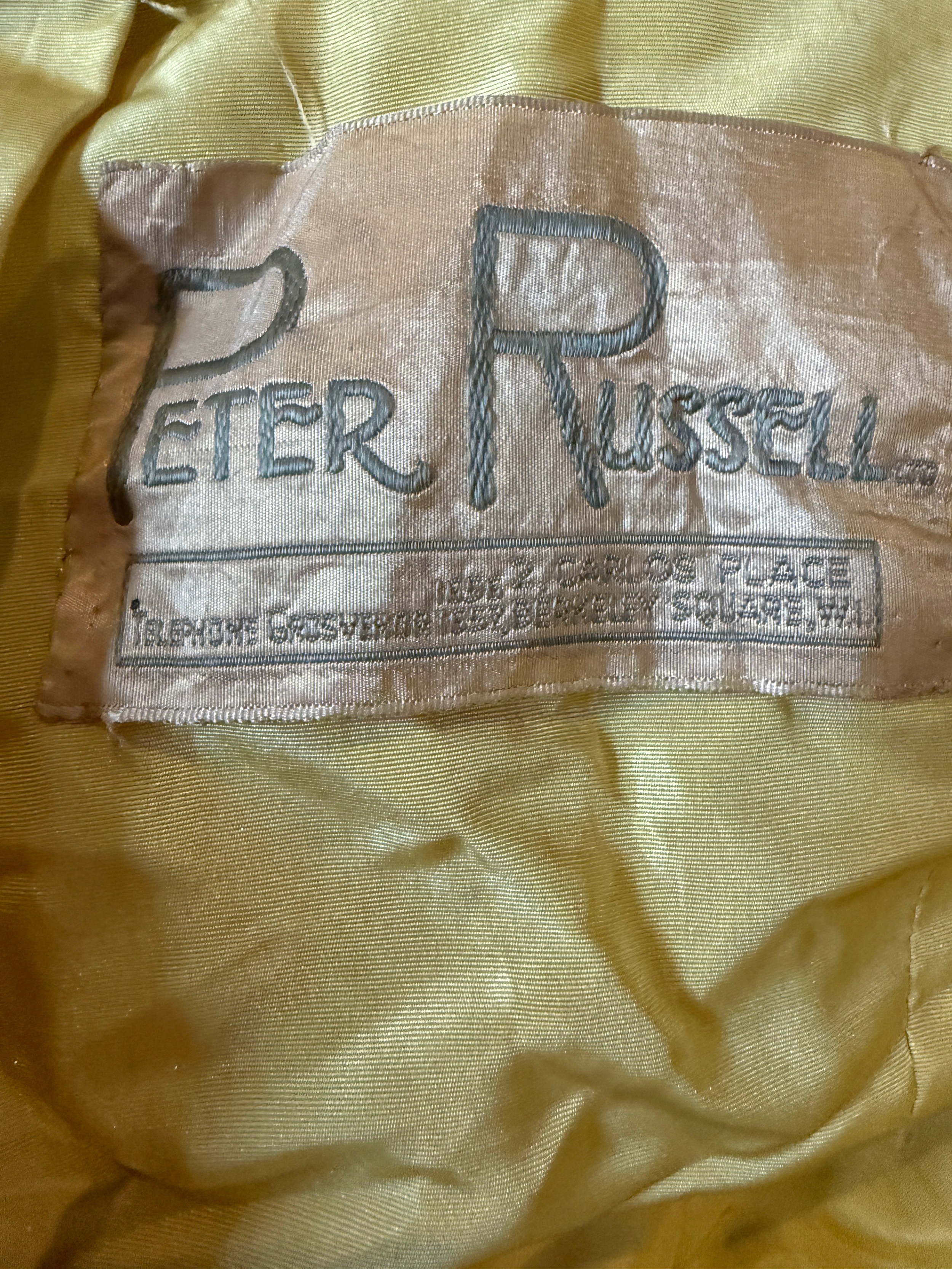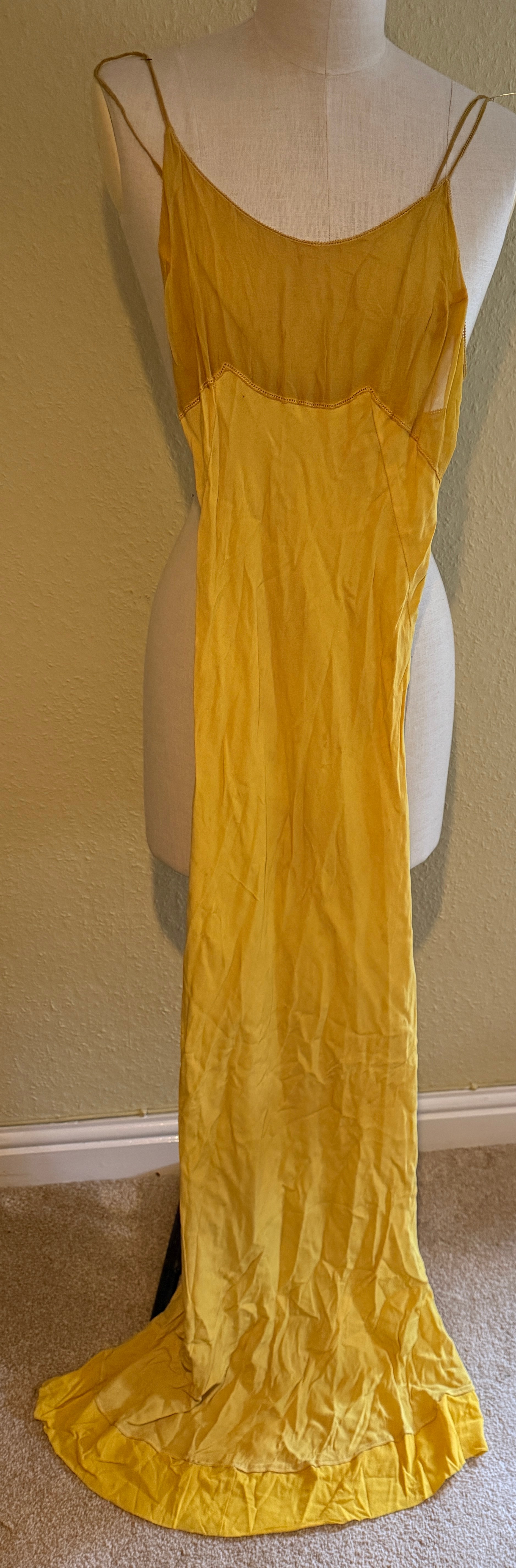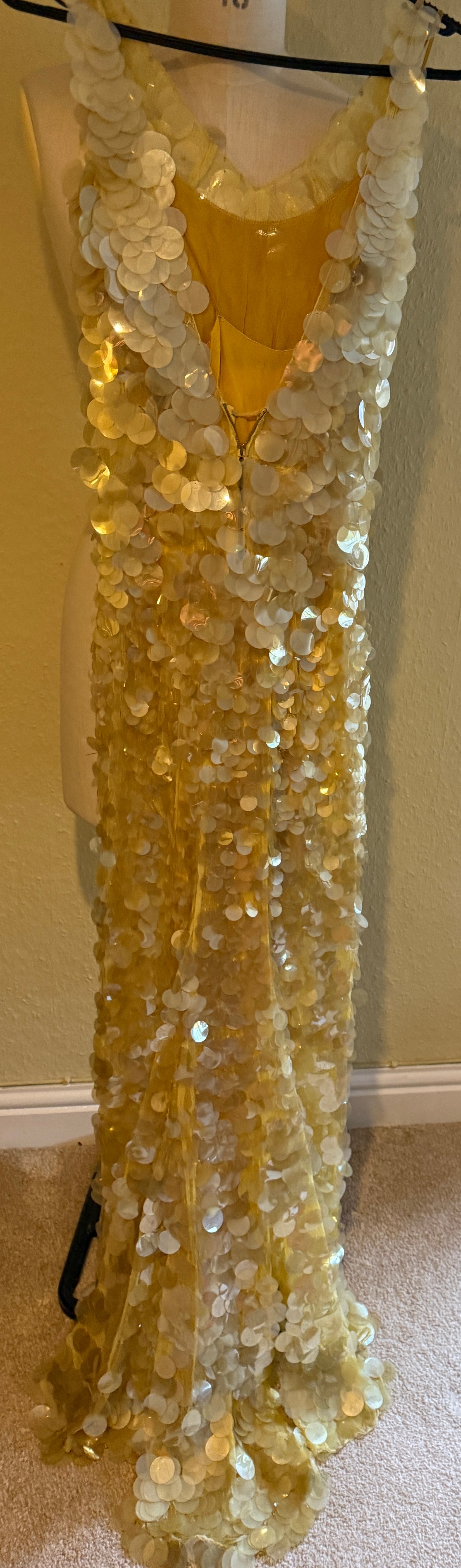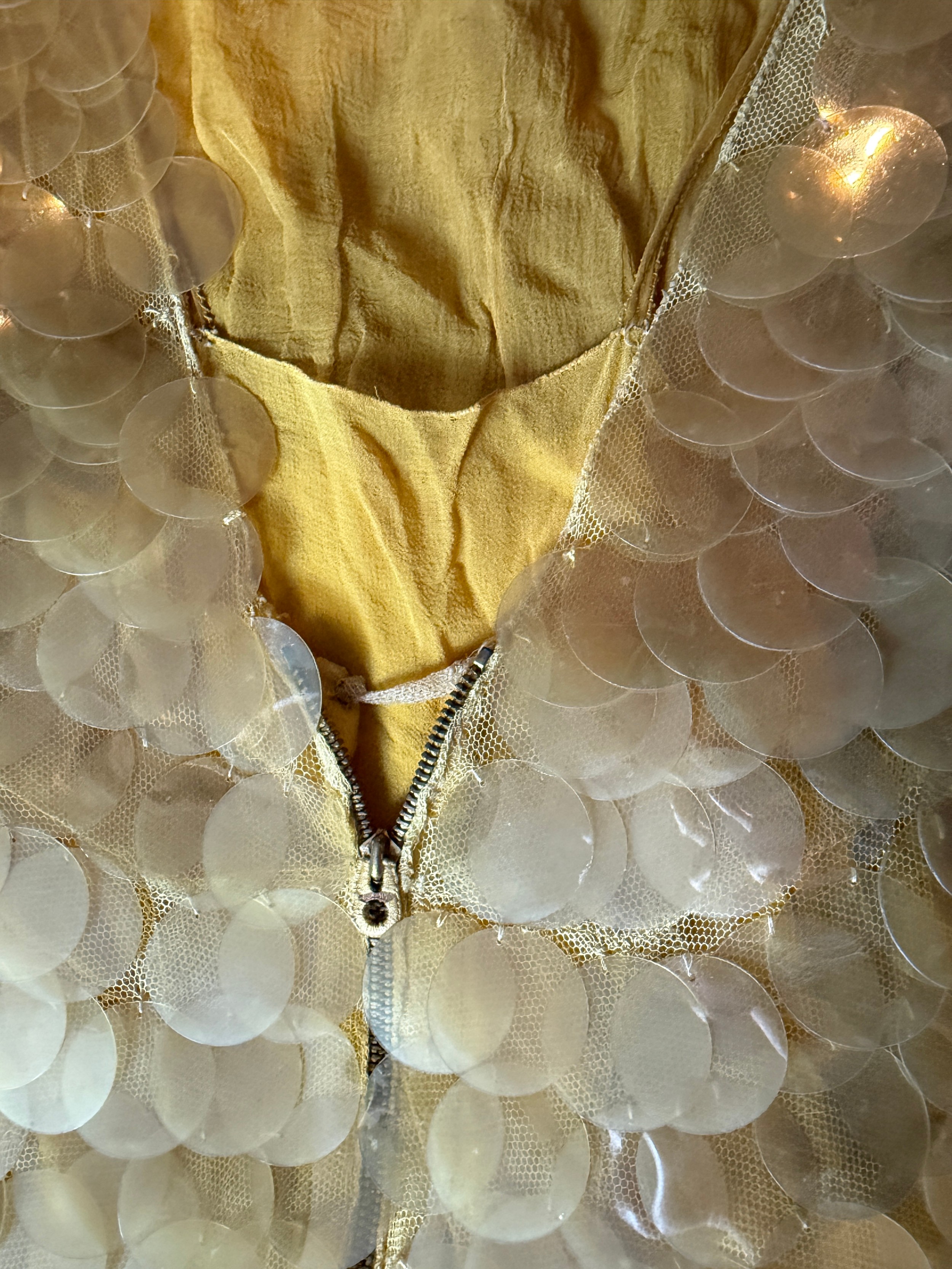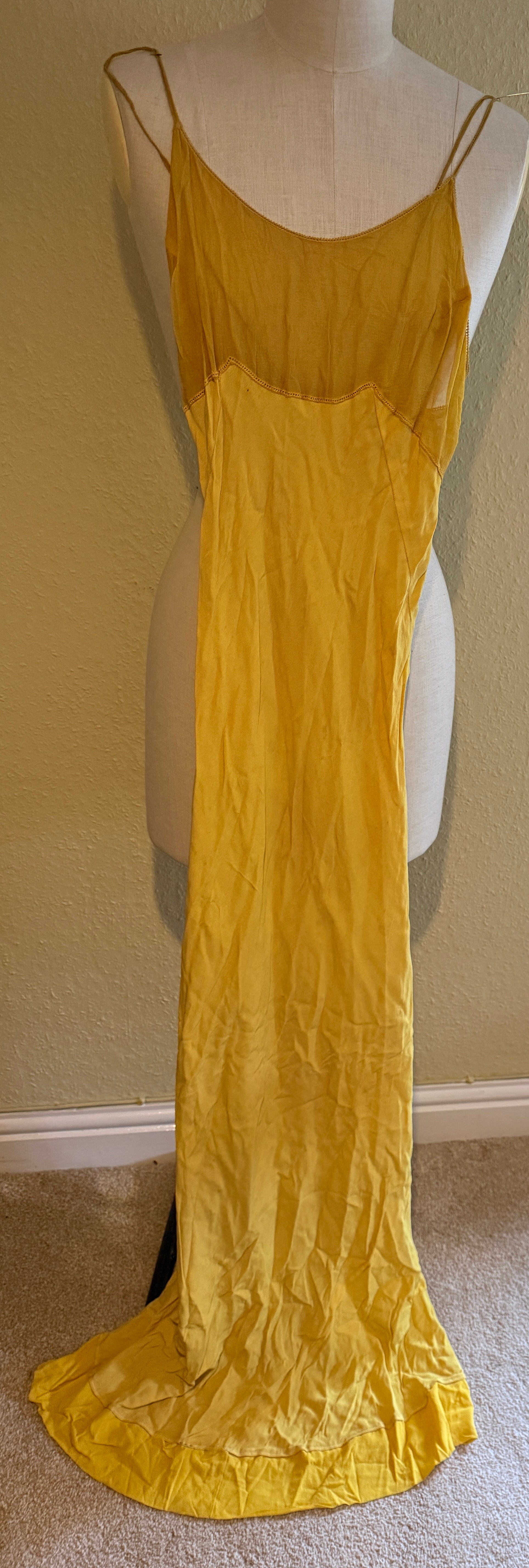 A 1930's Peter Russell canary yellow sequinned bias cut dress of cotton tulle over a silk crepe bias cut slip with silk chiffon bodice and shoestring straps, bust 32cms flat. This comes with a Peter Russell yellow silk velvet evening coat adorned with fox fur to both shoulders and sleeves, neck to hem 153cm, underarm to underarm approx. 44cms when flat.