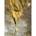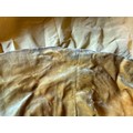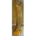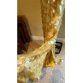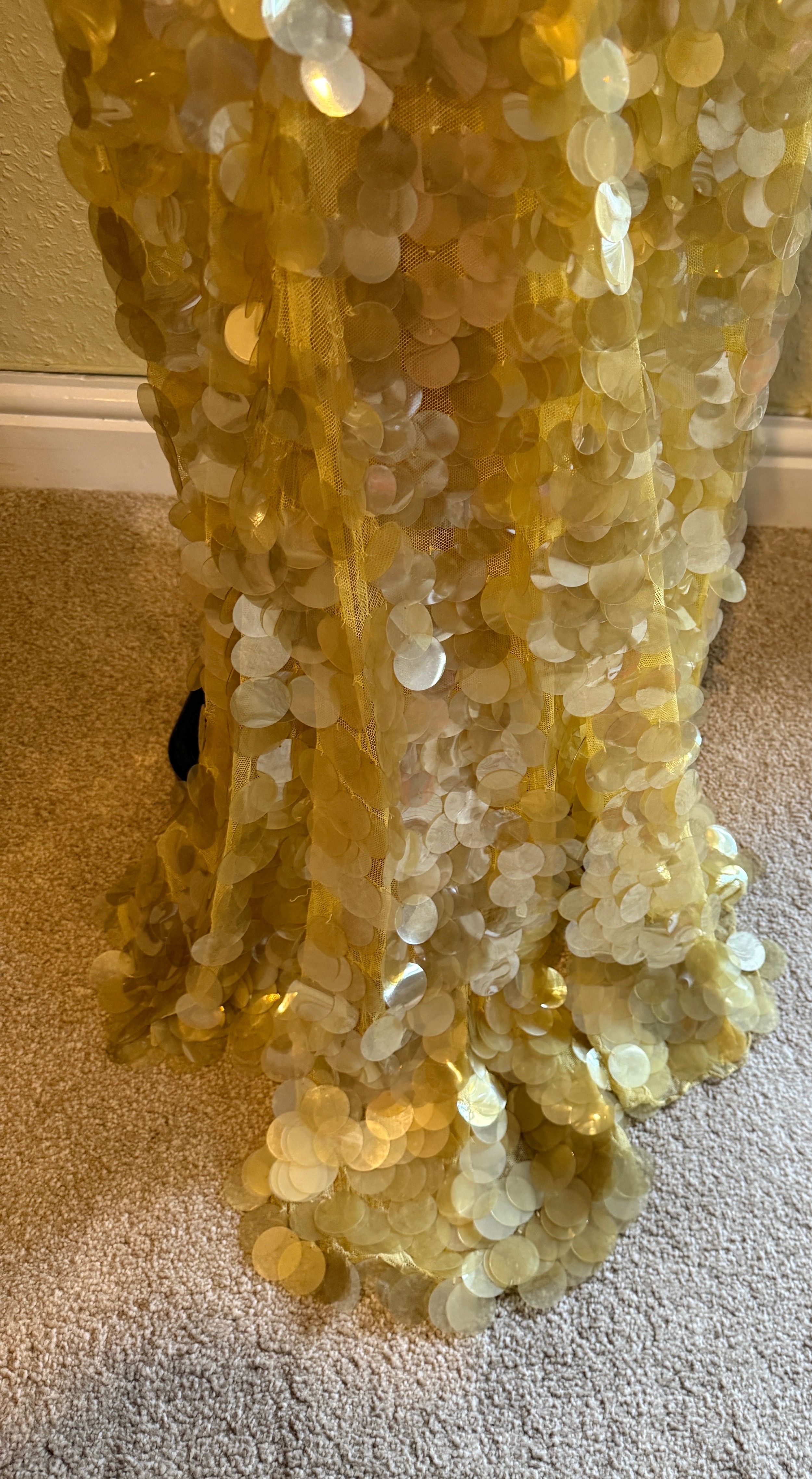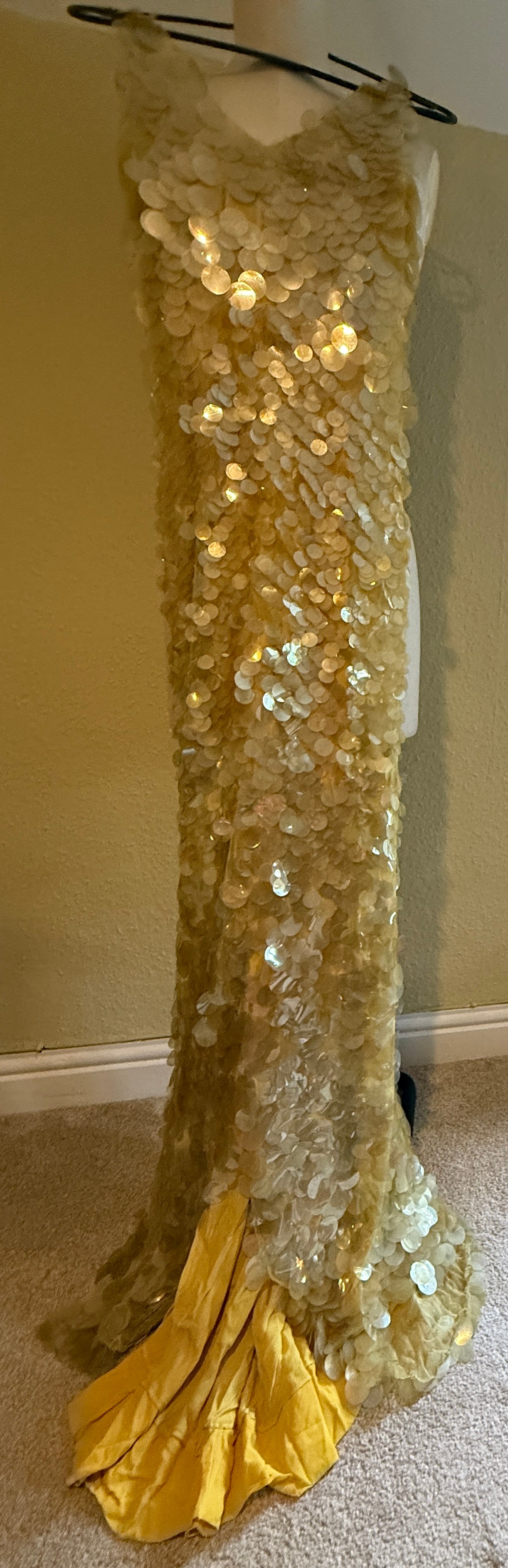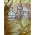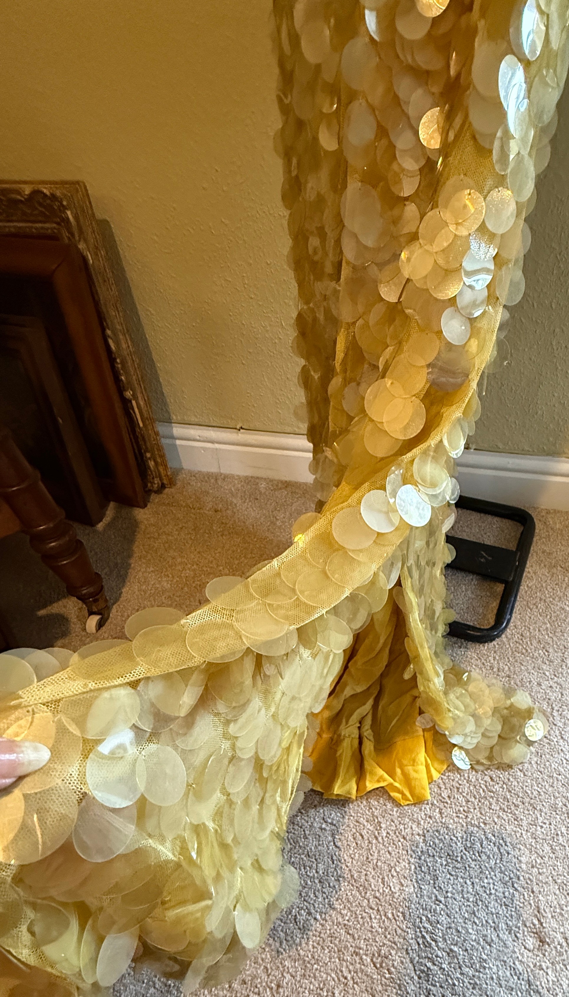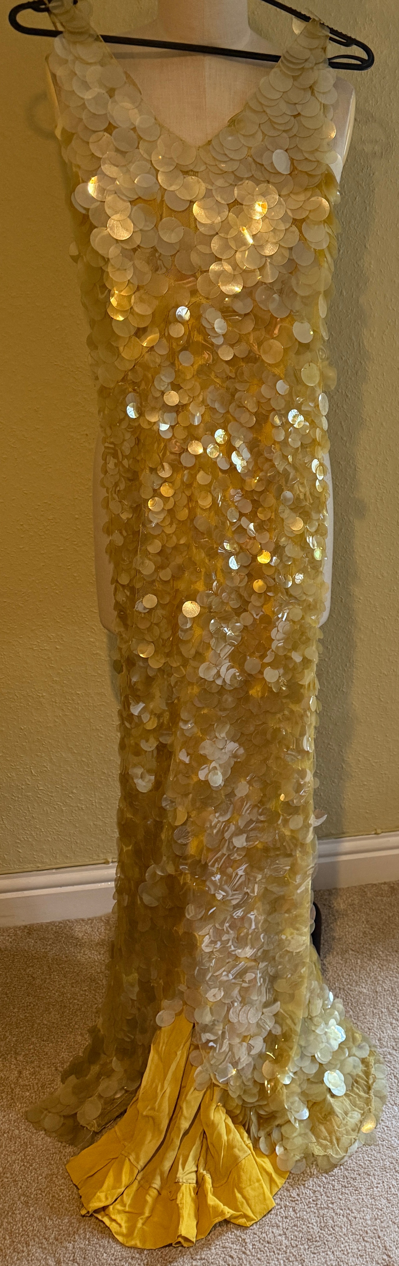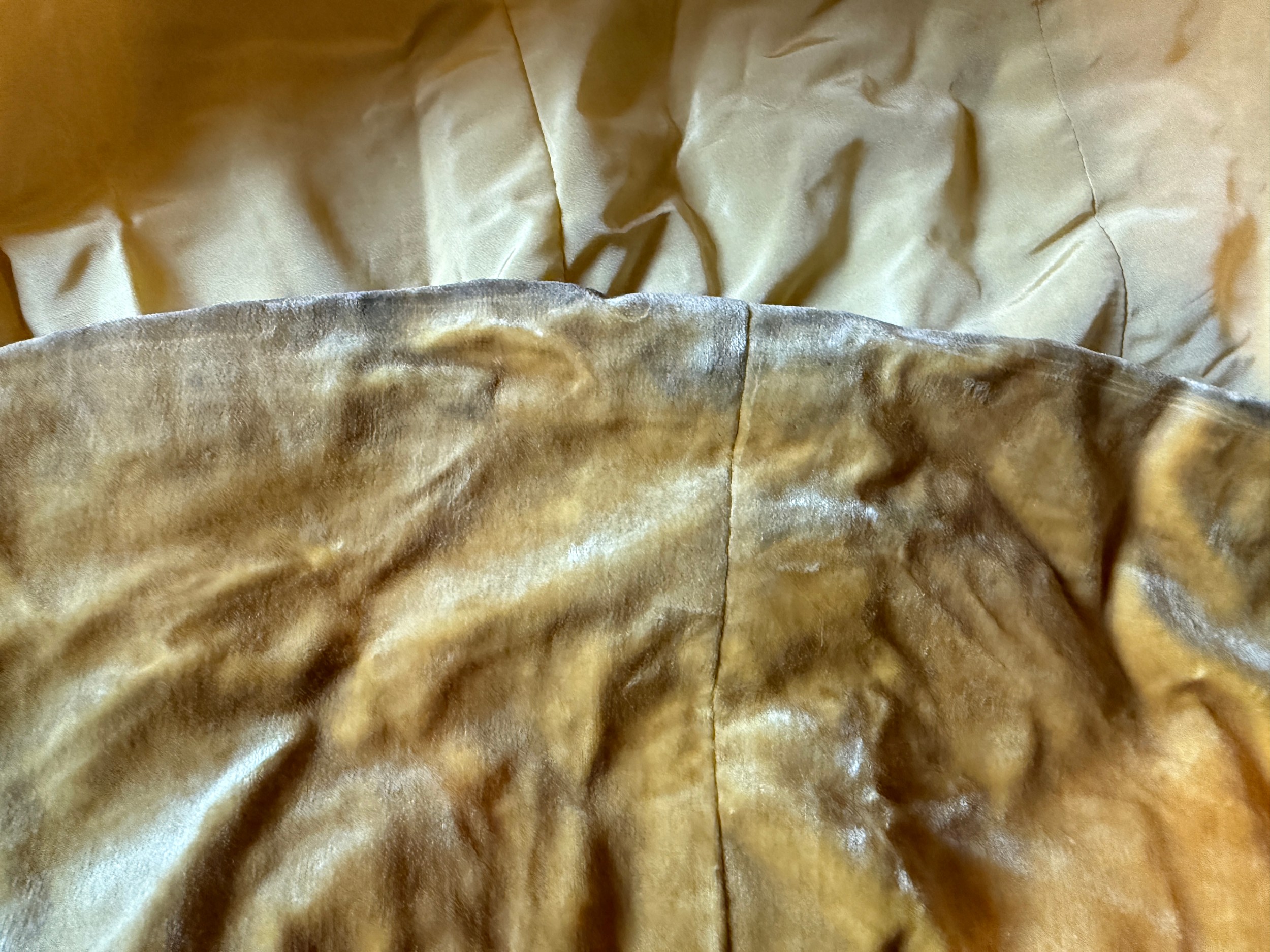 A 1930's Peter Russell canary yellow sequinned bias cut dress of cotton tulle over a silk crepe bias cut slip with silk chiffon bodice and shoestring straps, bust 32cms flat. This comes with a Peter Russell yellow silk velvet evening coat adorned with fox fur to both shoulders and sleeves, neck to hem 153cm, underarm to underarm approx. 44cms when flat.