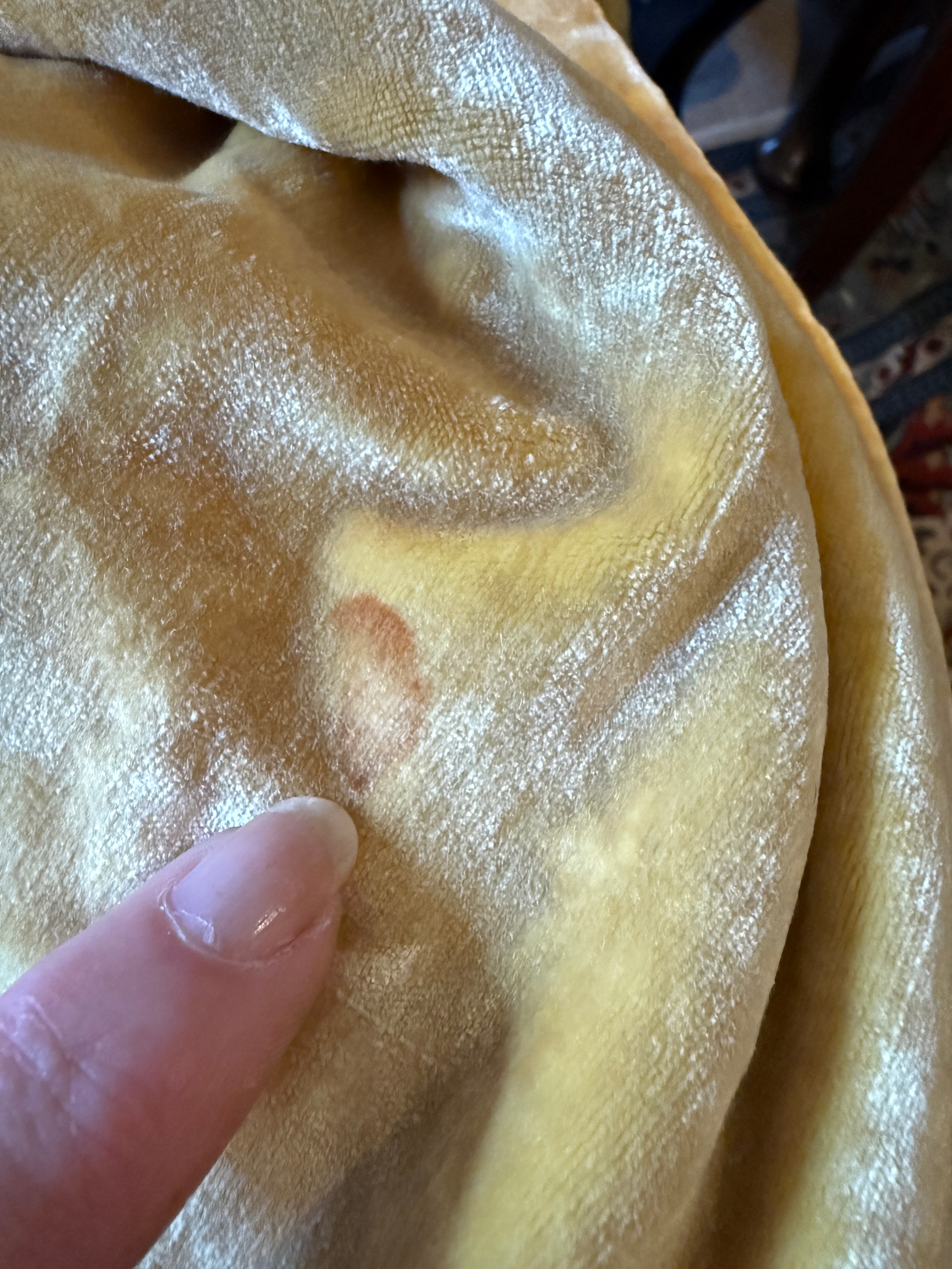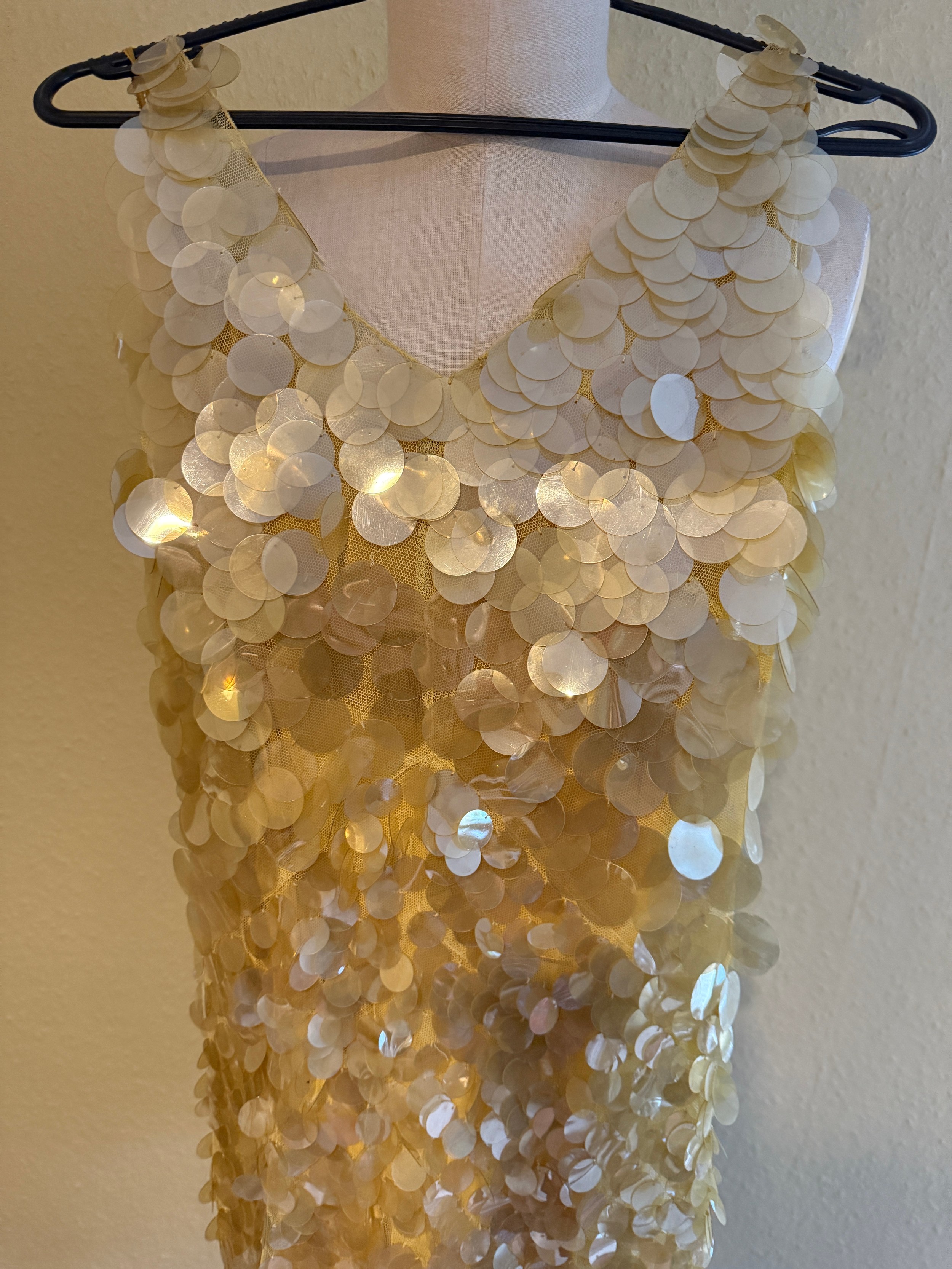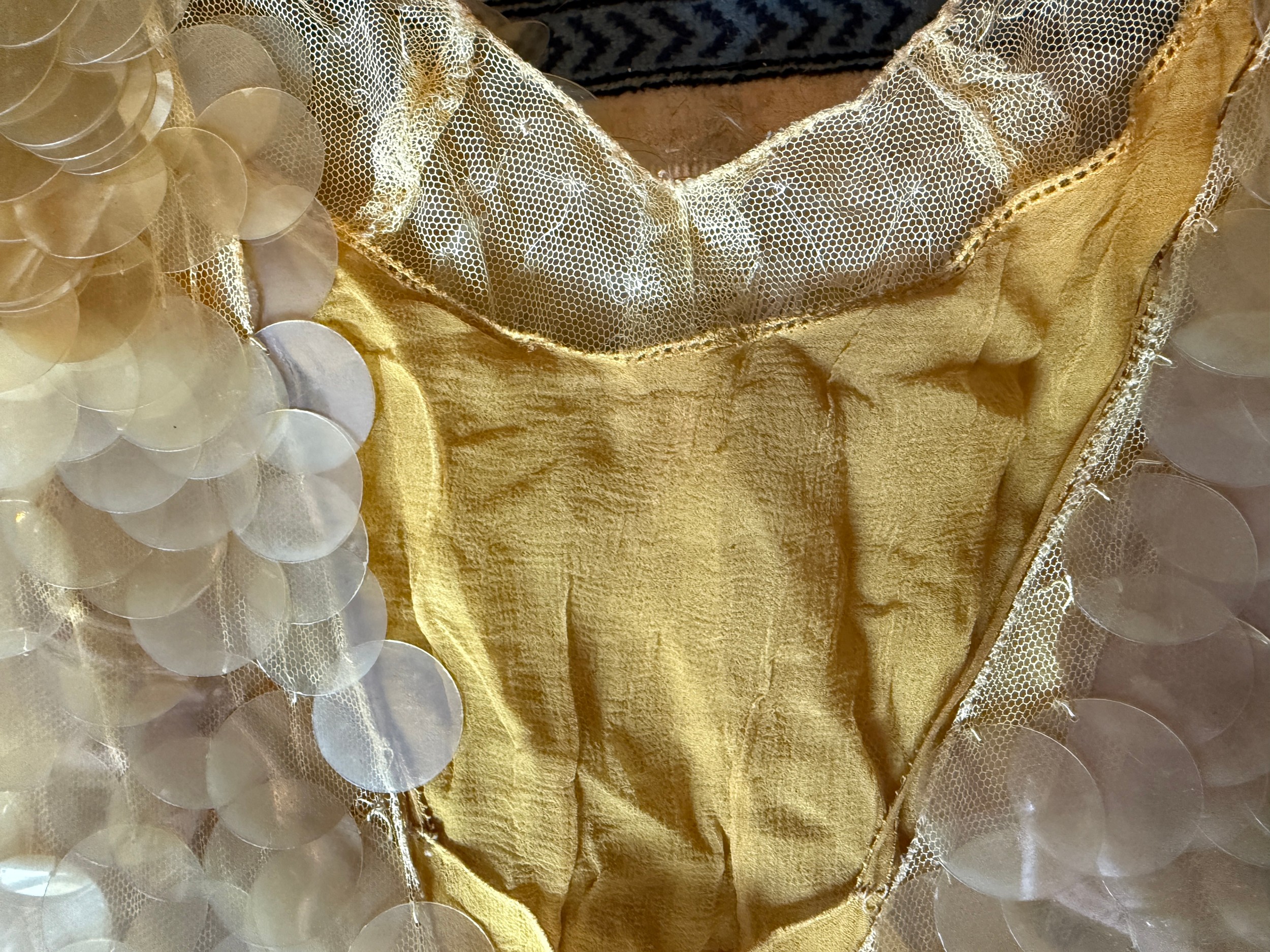 Slip appears in good condition. Dress with sequin losses and losing sequins when handled. Any lost during lotting are present. Coat with label and one stain to lining, mark to velvet at front and soiling around the hem.