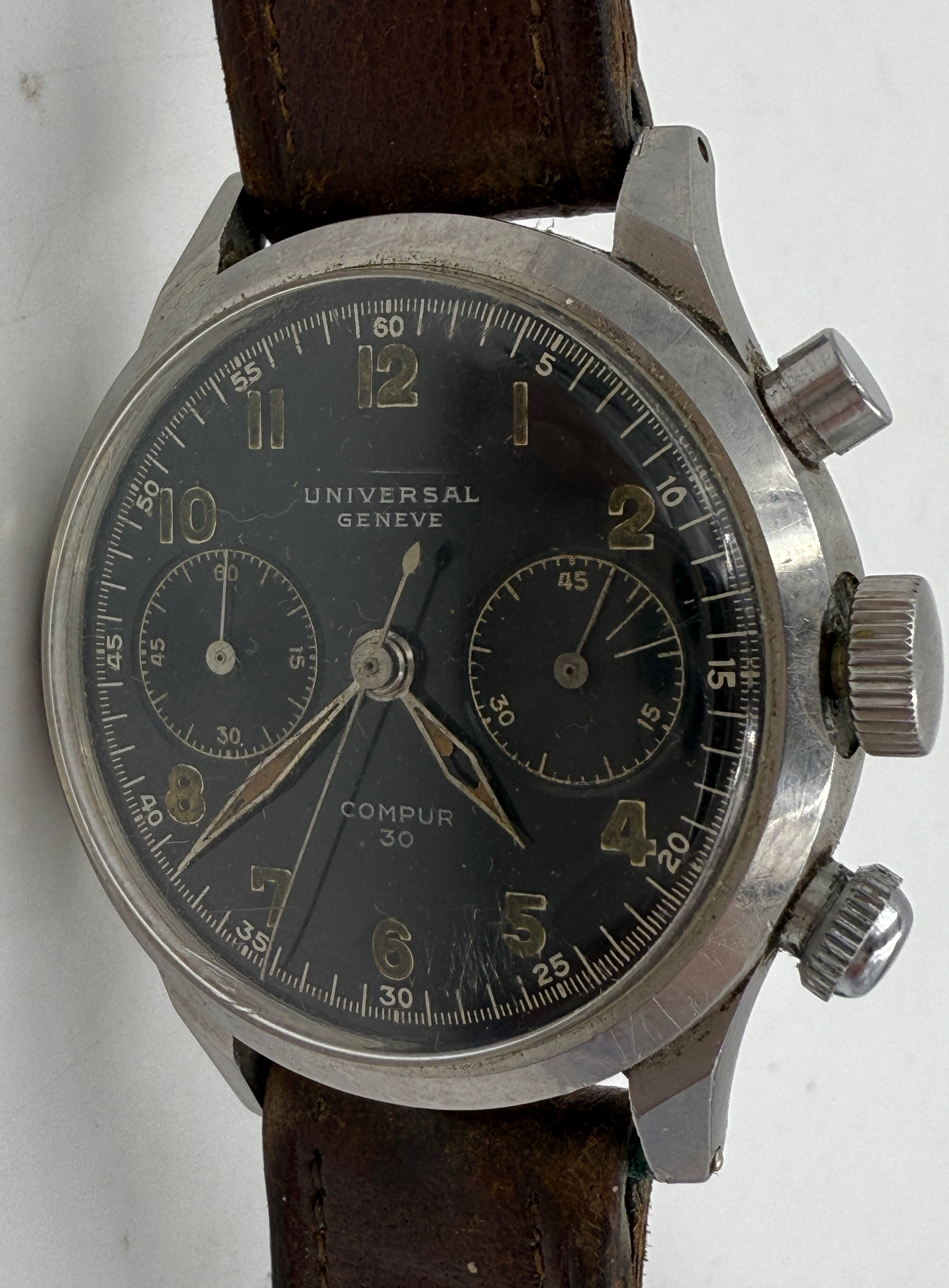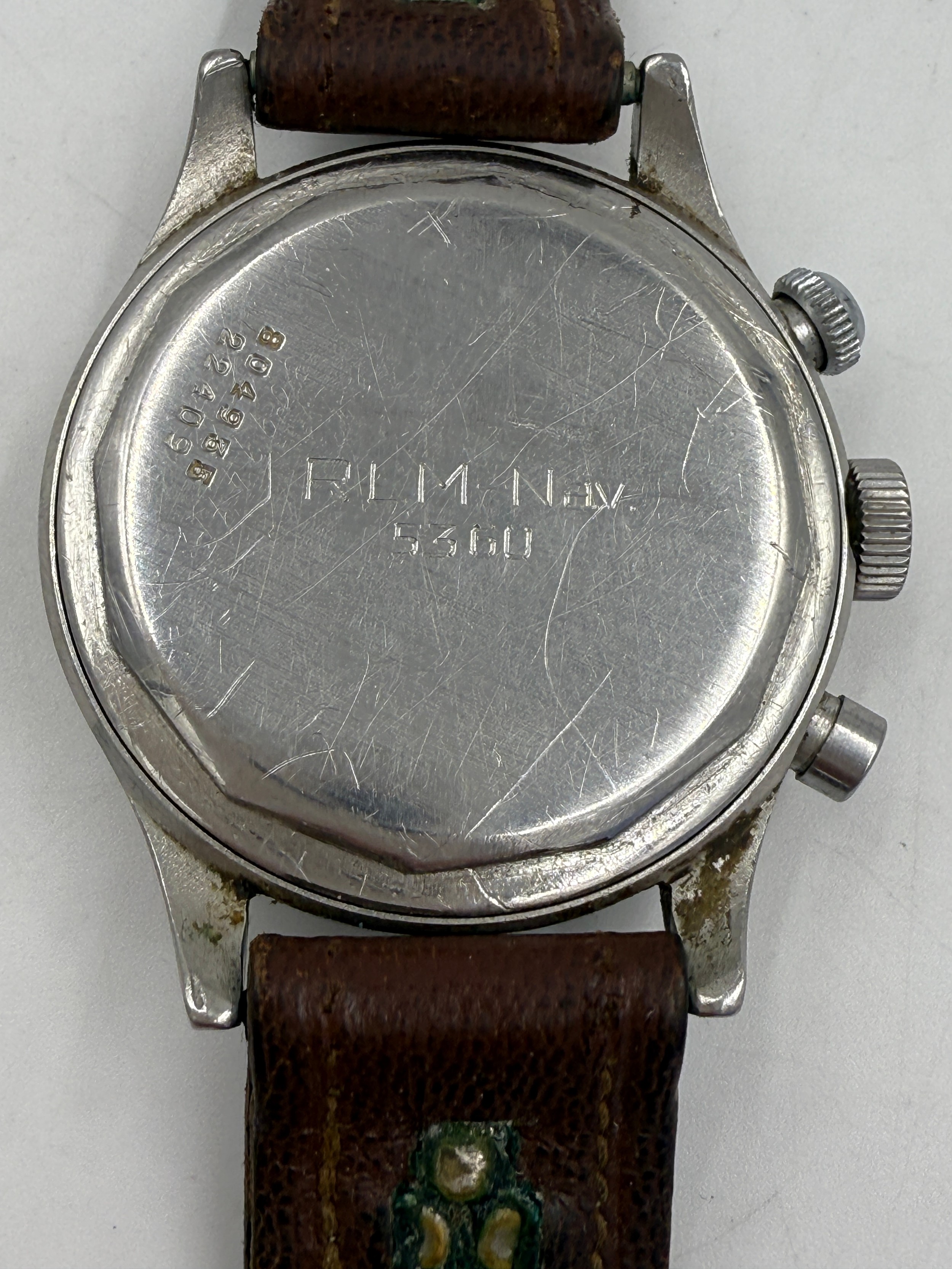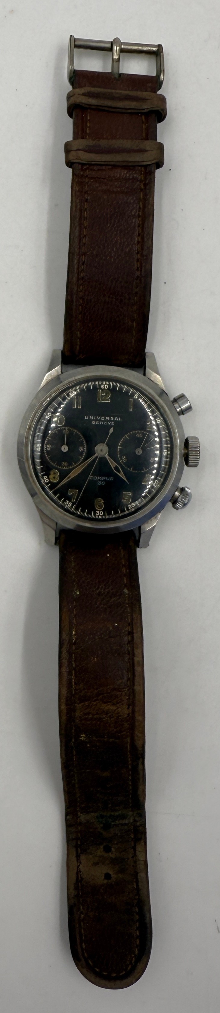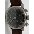 A Universal Chronograph Geneve Compur 30 gentleman's wristwatch, circa 1940-41, Spillmann case back inscribed 'RLM-Nav. 5360', serial no. 804935, watch case no. 22409. Supplied to the German Ministry of Aviation, the Reichsluftfahrtministerium (RLM), to be used by navigators and observers of the Luftwaffe for aerial navigation.