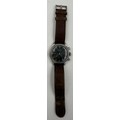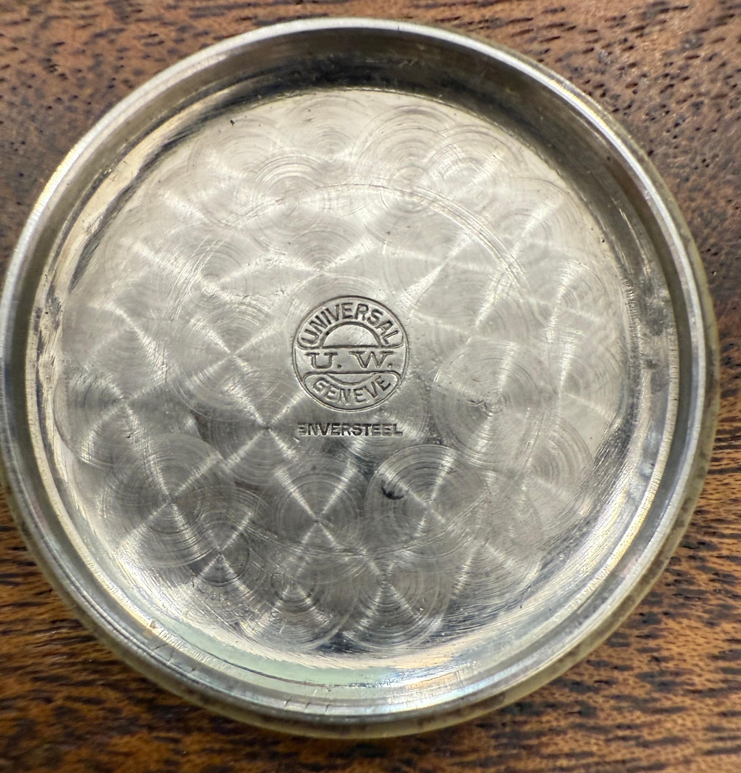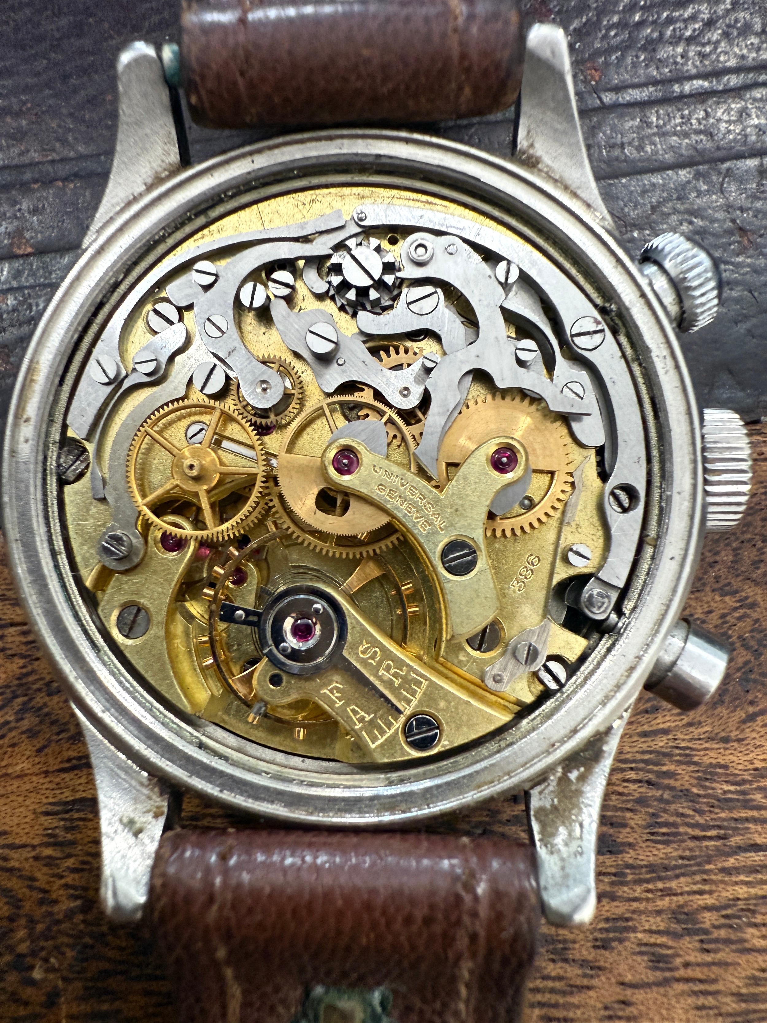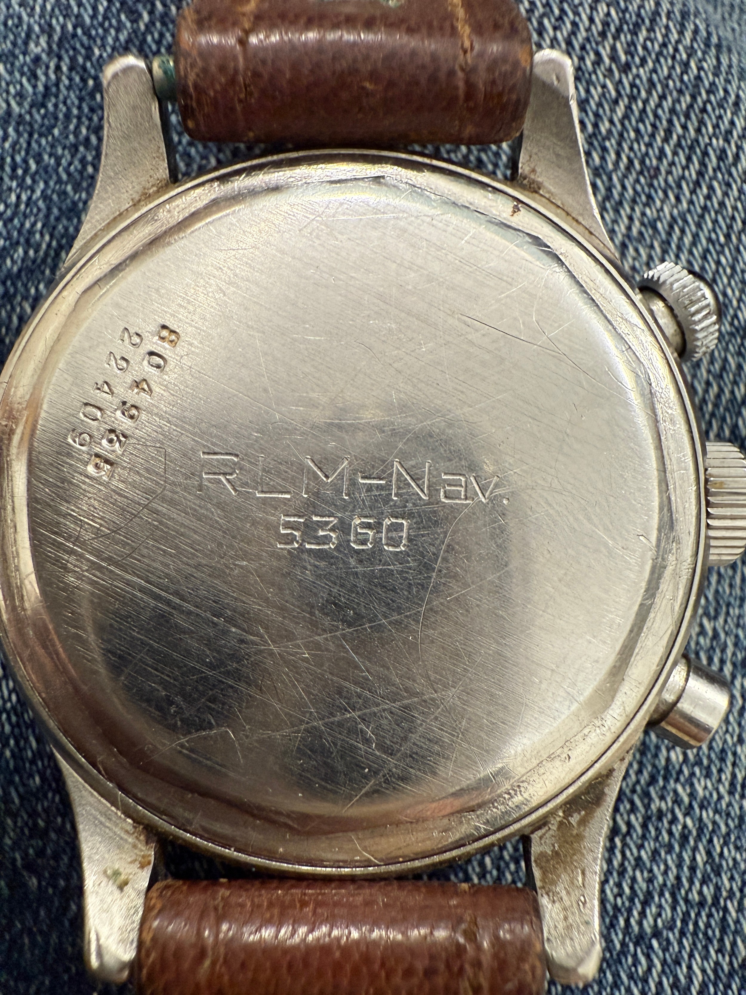 A Universal Chronograph Geneve Compur 30 gentleman's wristwatch, circa 1940-41, Spillmann case back inscribed 'RLM-Nav. 5360', serial no. 804935, watch case no. 22409. Supplied to the German Ministry of Aviation, the Reichsluftfahrtministerium (RLM), to be used by navigators and observers of the Luftwaffe for aerial navigation.
