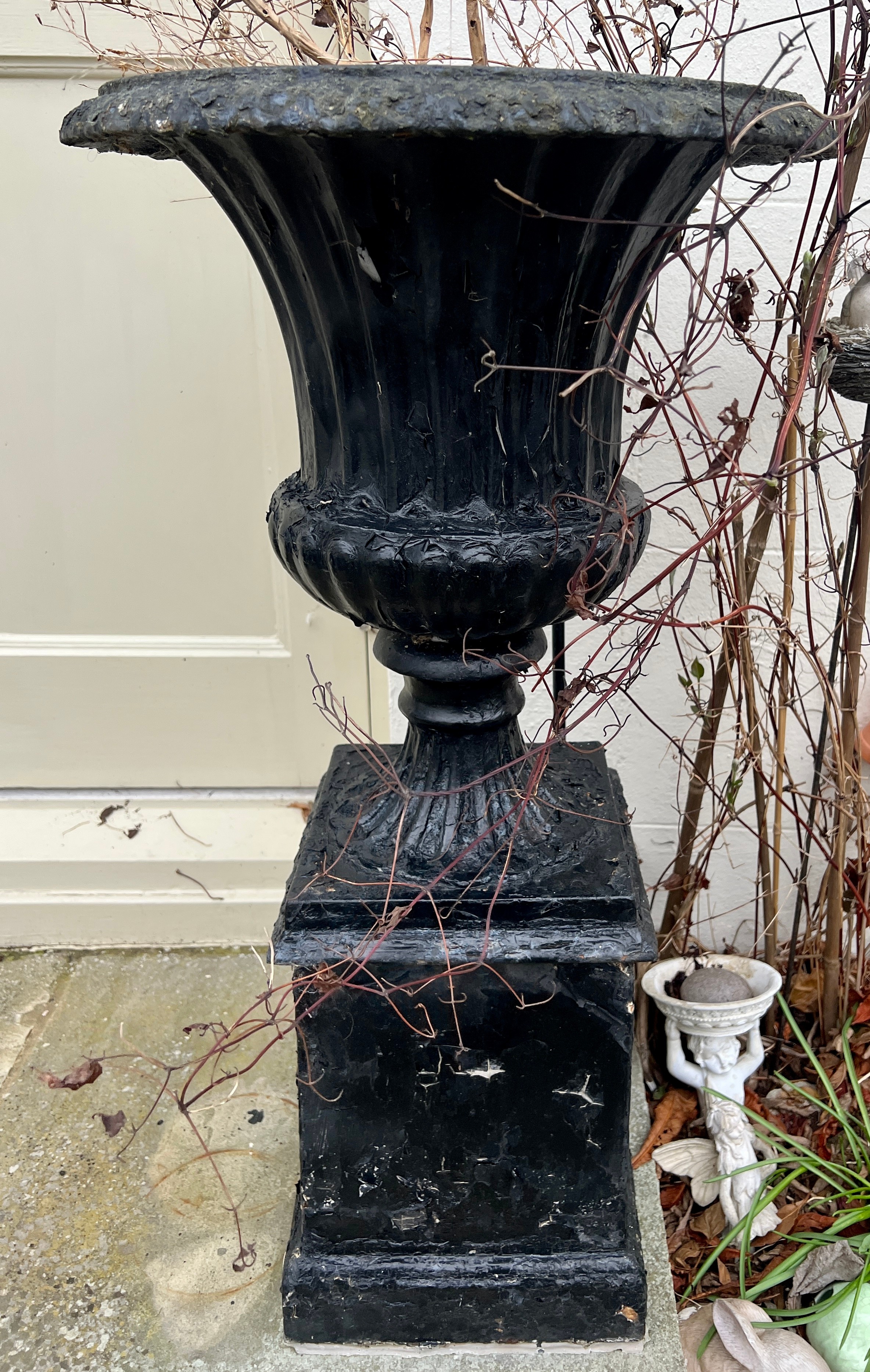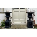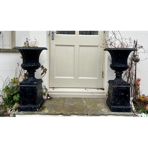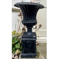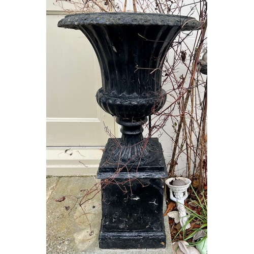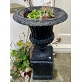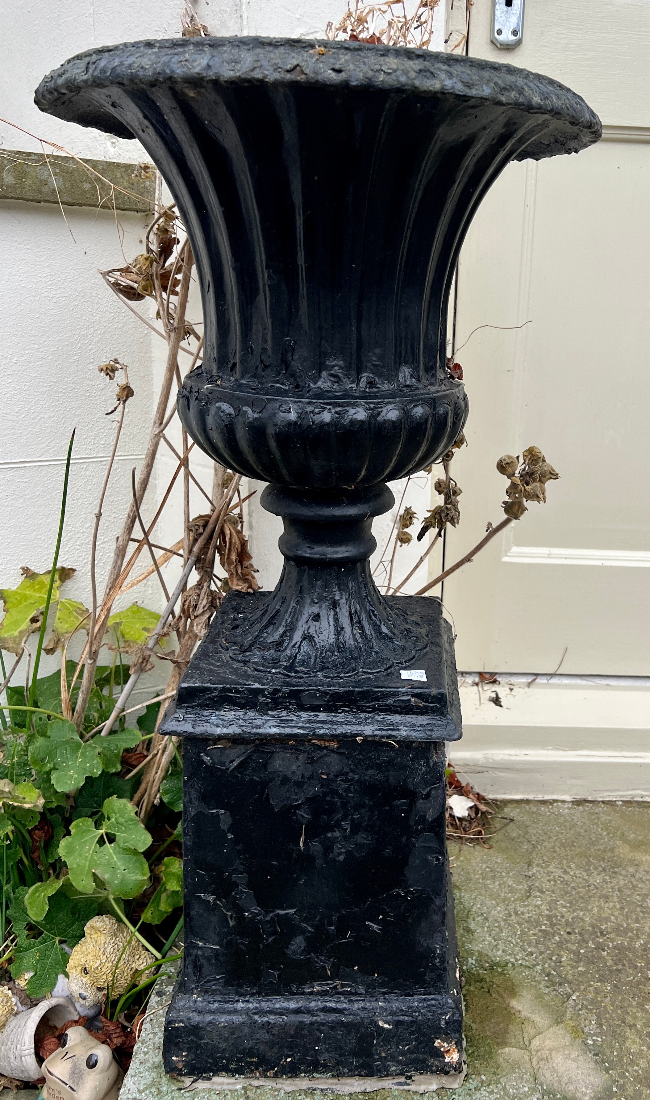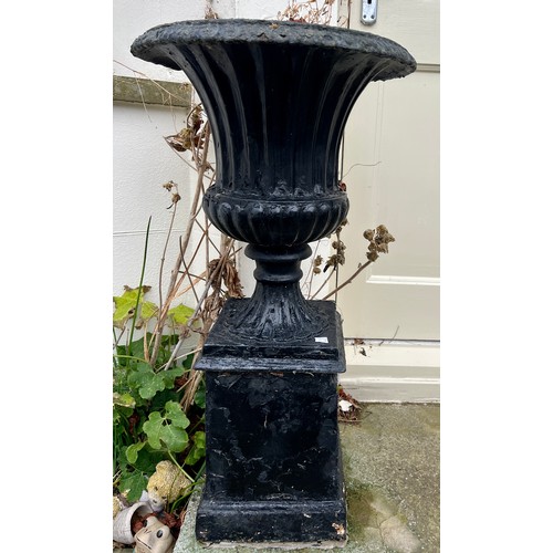 Two 19thC cast iron urns on pedestal bases. 85cm h.