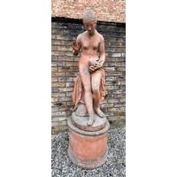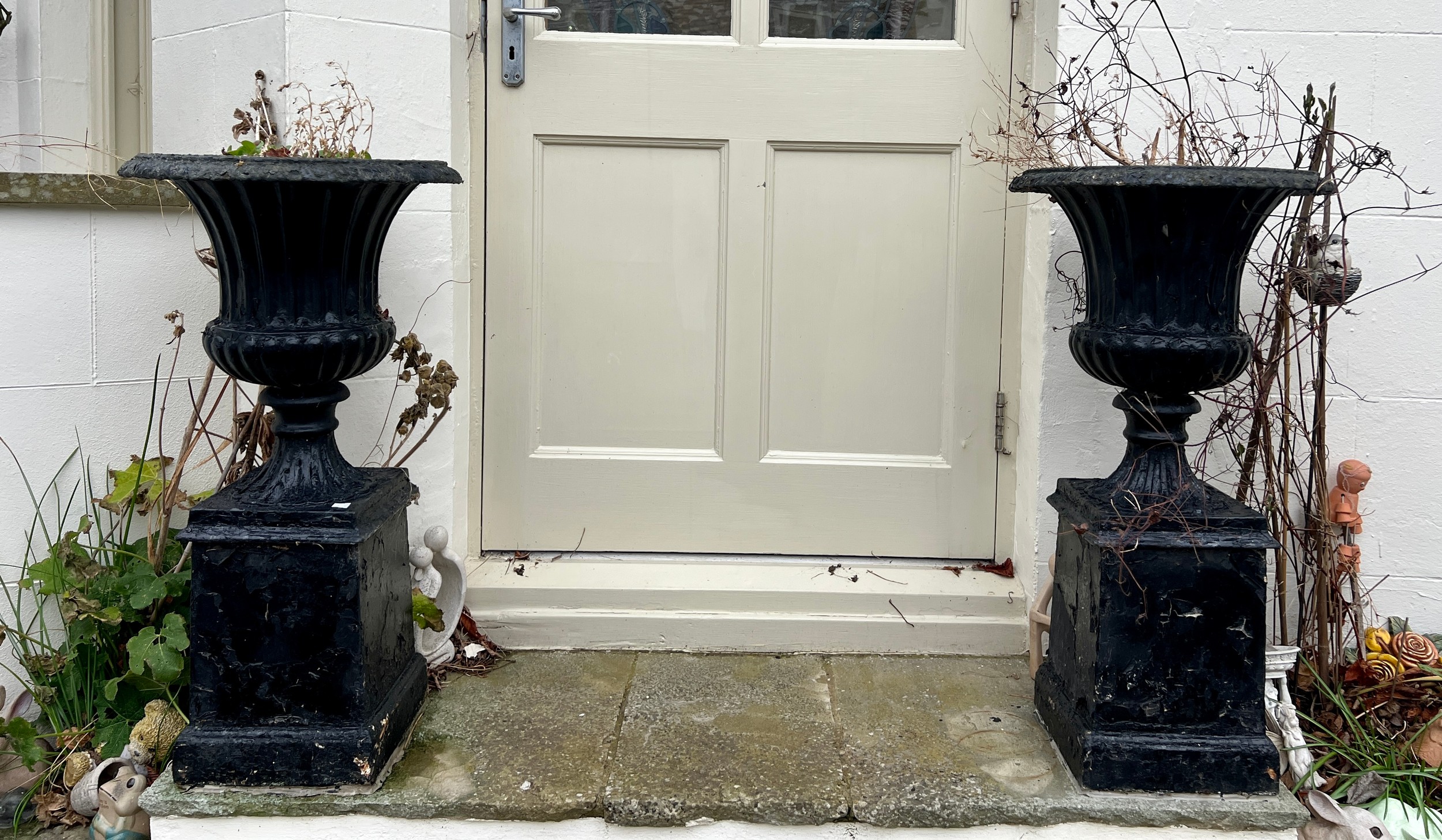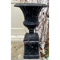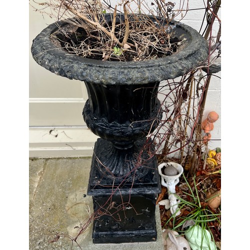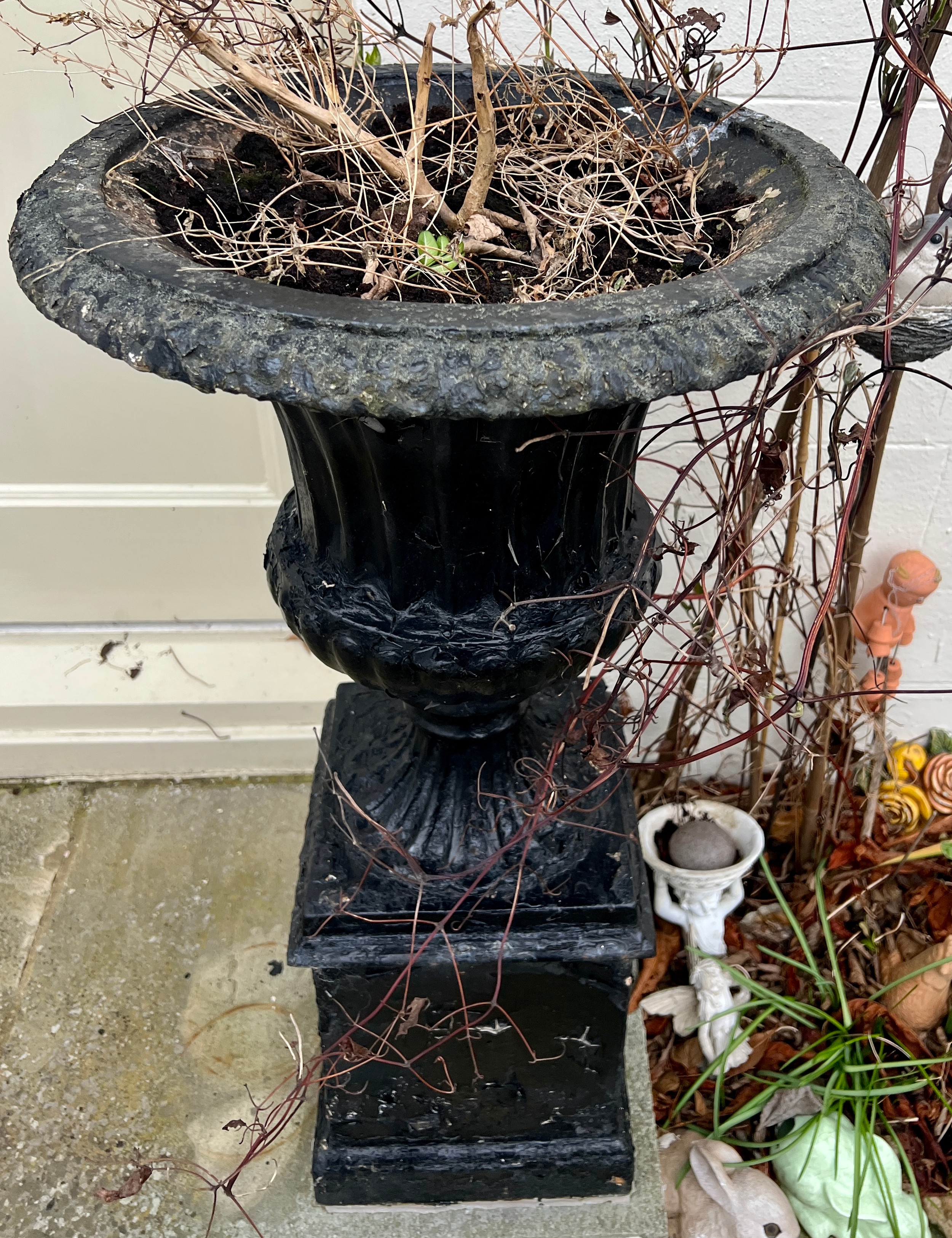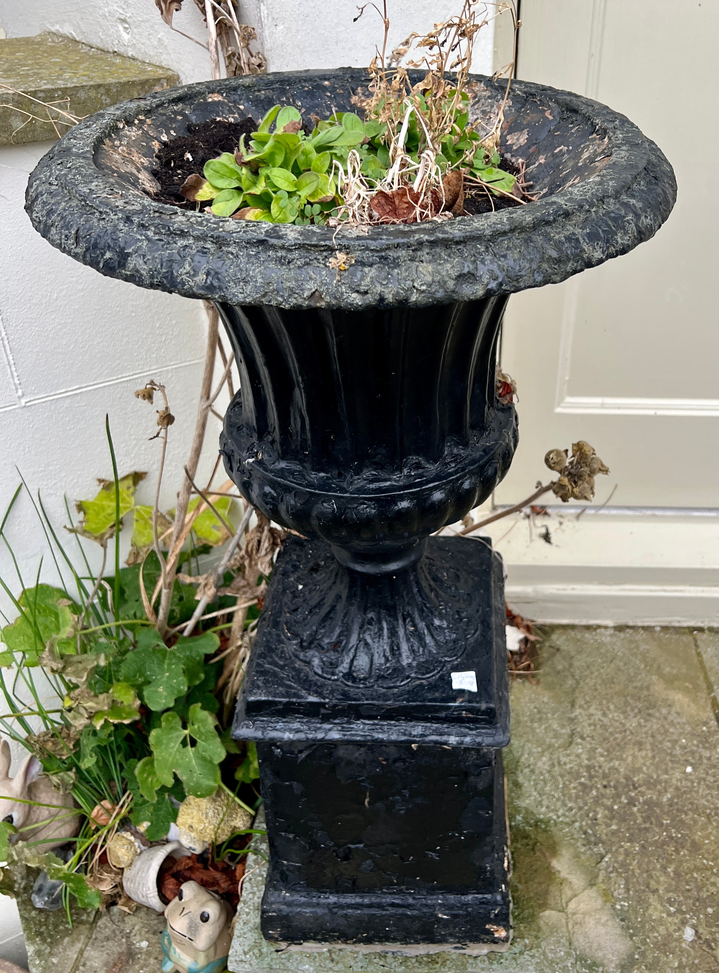 Two 19thC cast iron urns on pedestal bases. 85cm h.