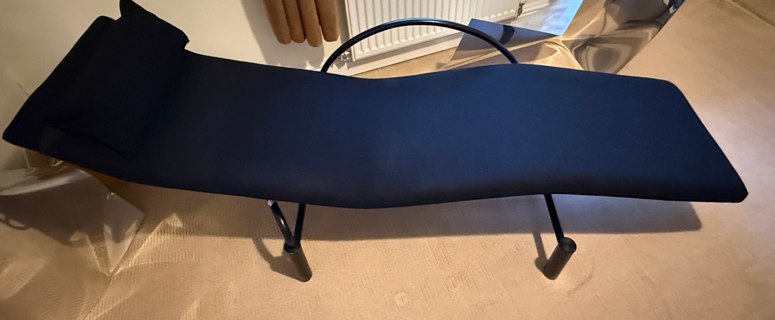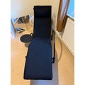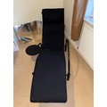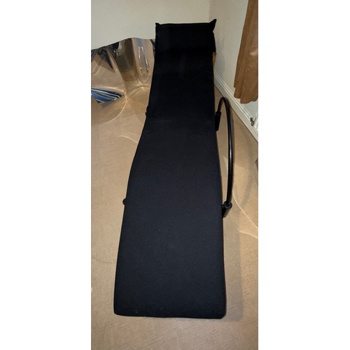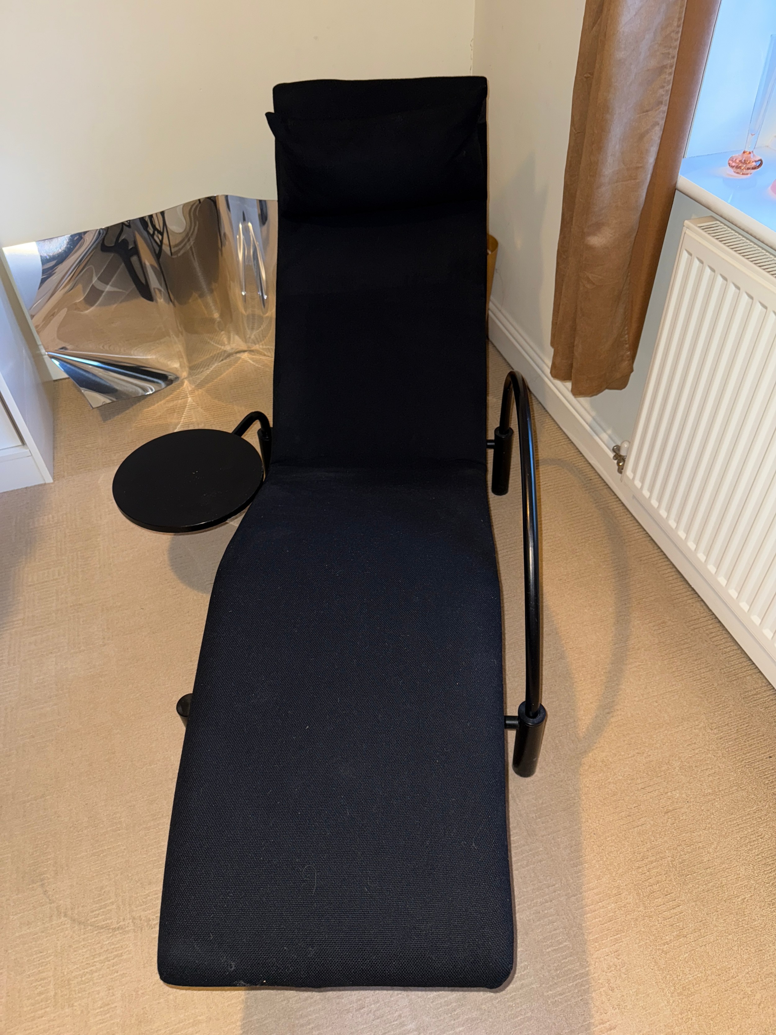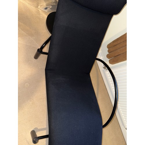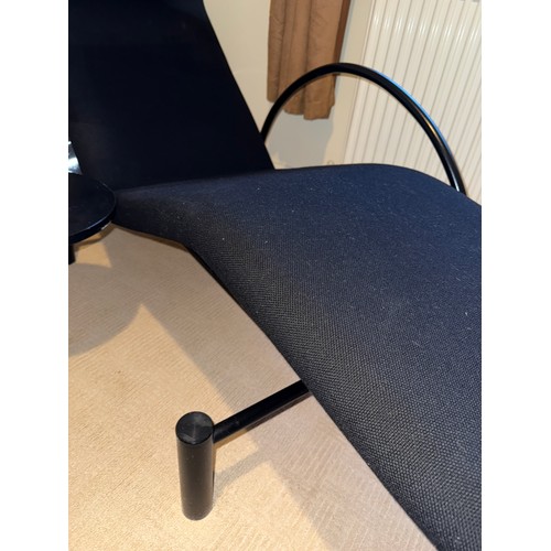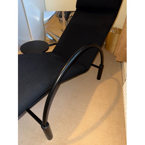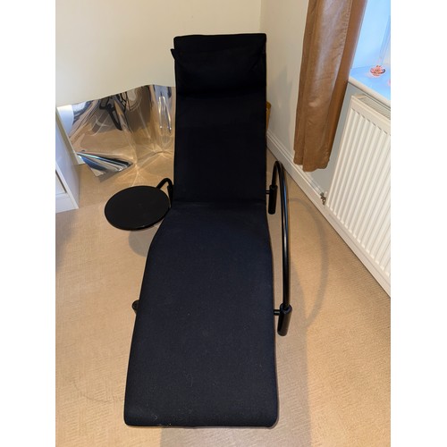 A good quality black metal and fabric covered reclining lounger with attached swivel table, in the style of Le Corbusier. Length reclined 181 x 47cm.