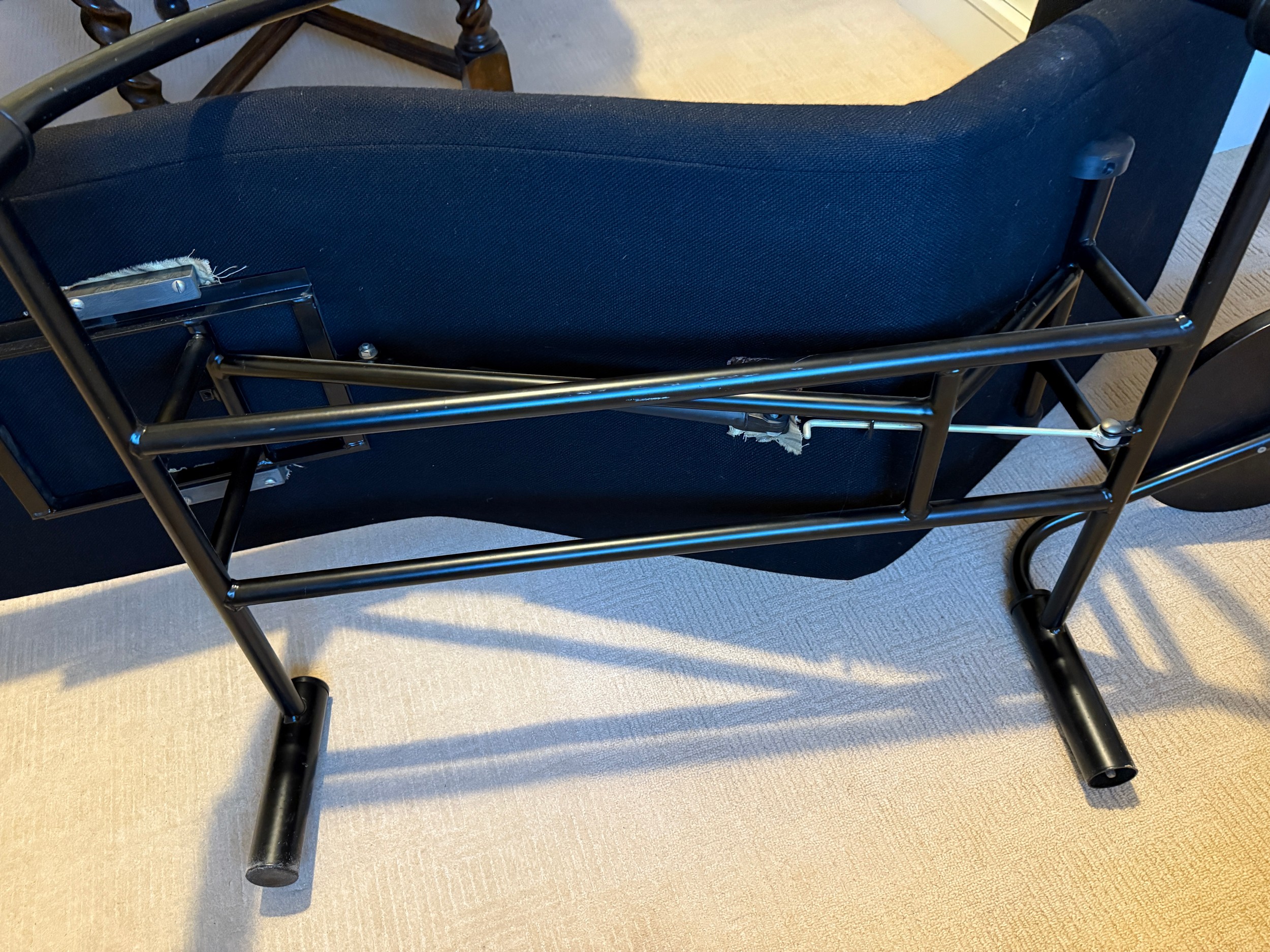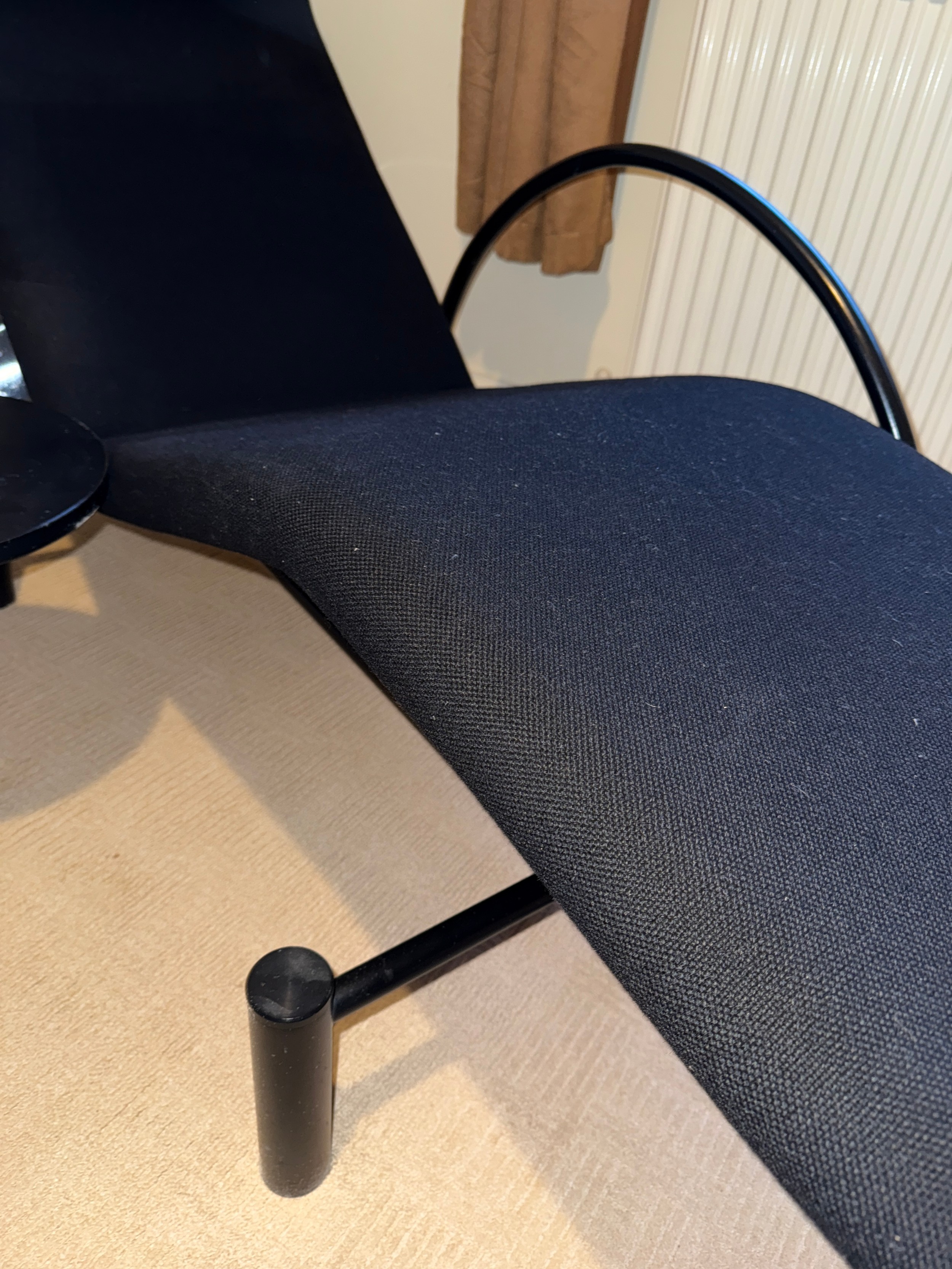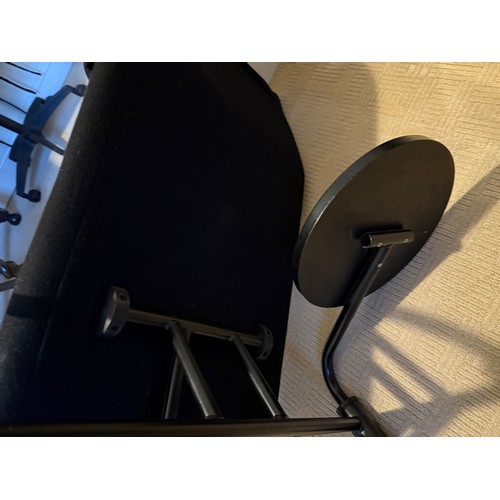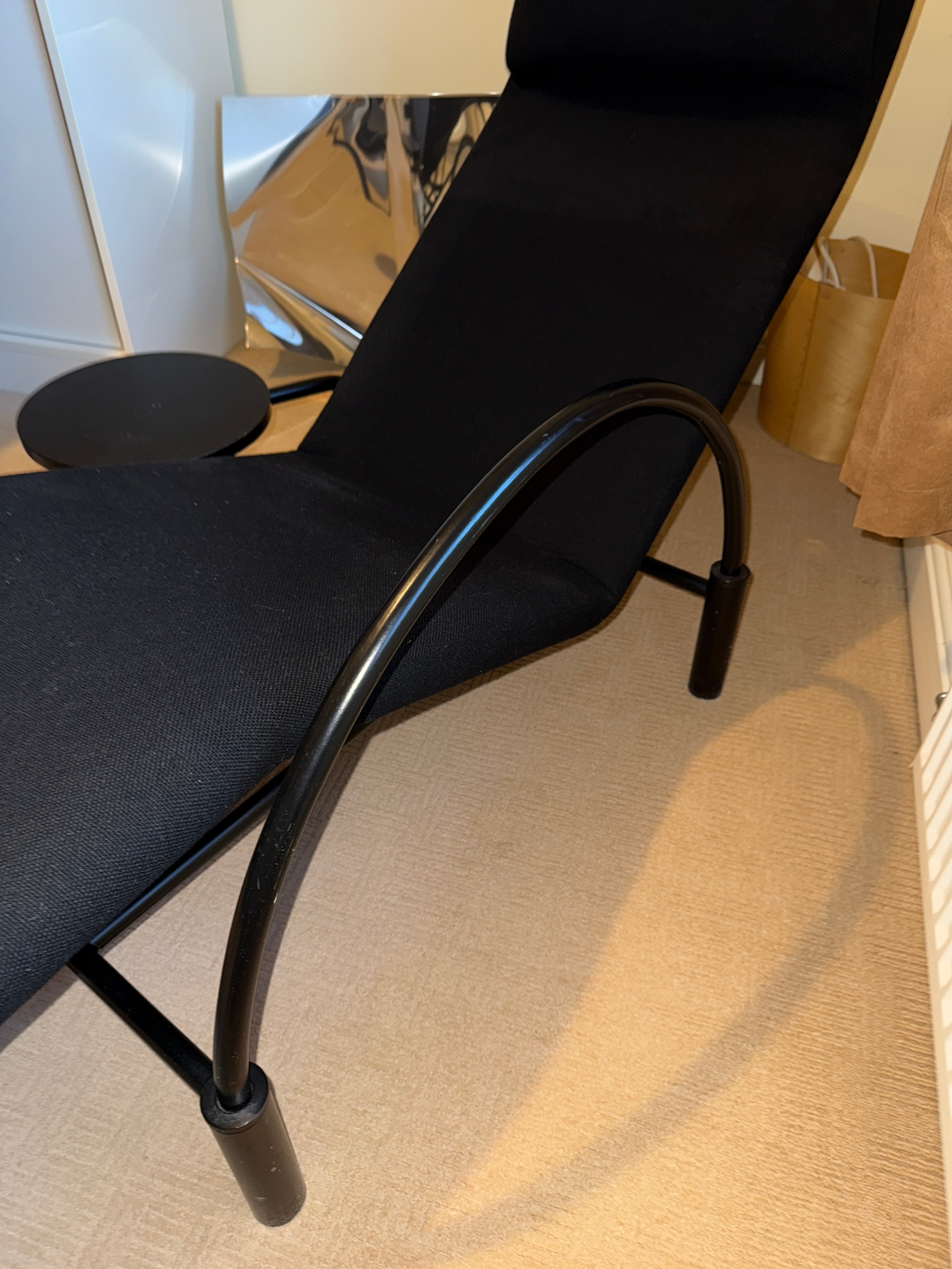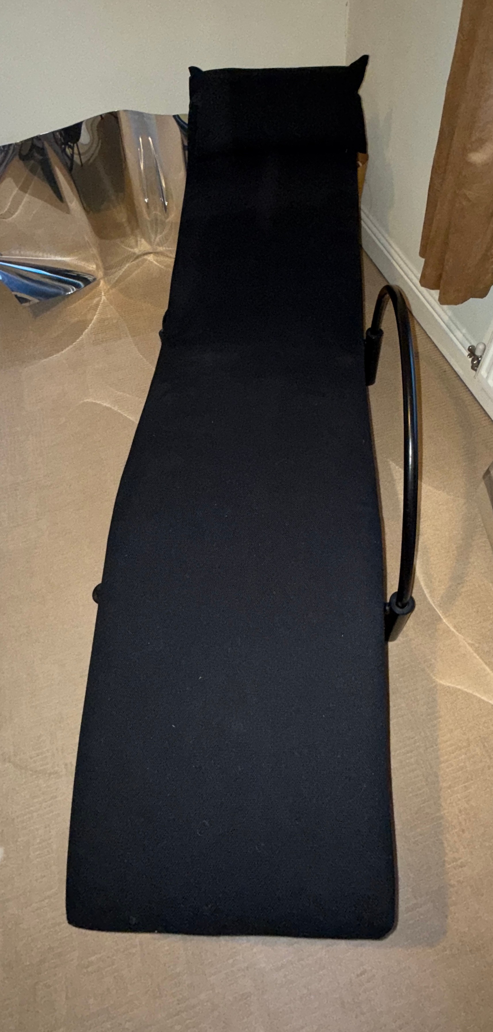 A good quality black metal and fabric covered reclining lounger with attached swivel table, in the style of Le Corbusier. Length reclined 181 x 47cm.
