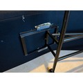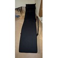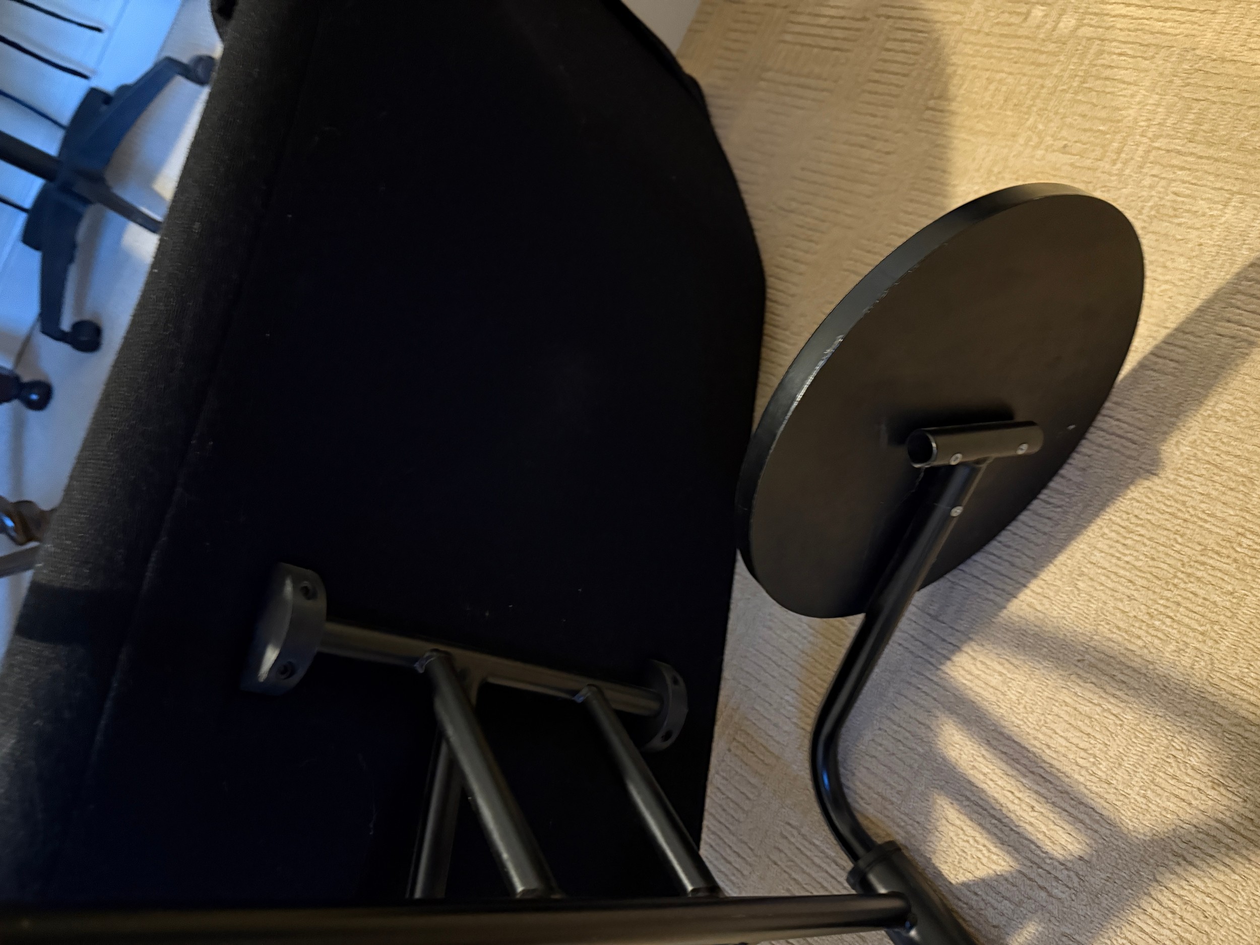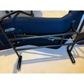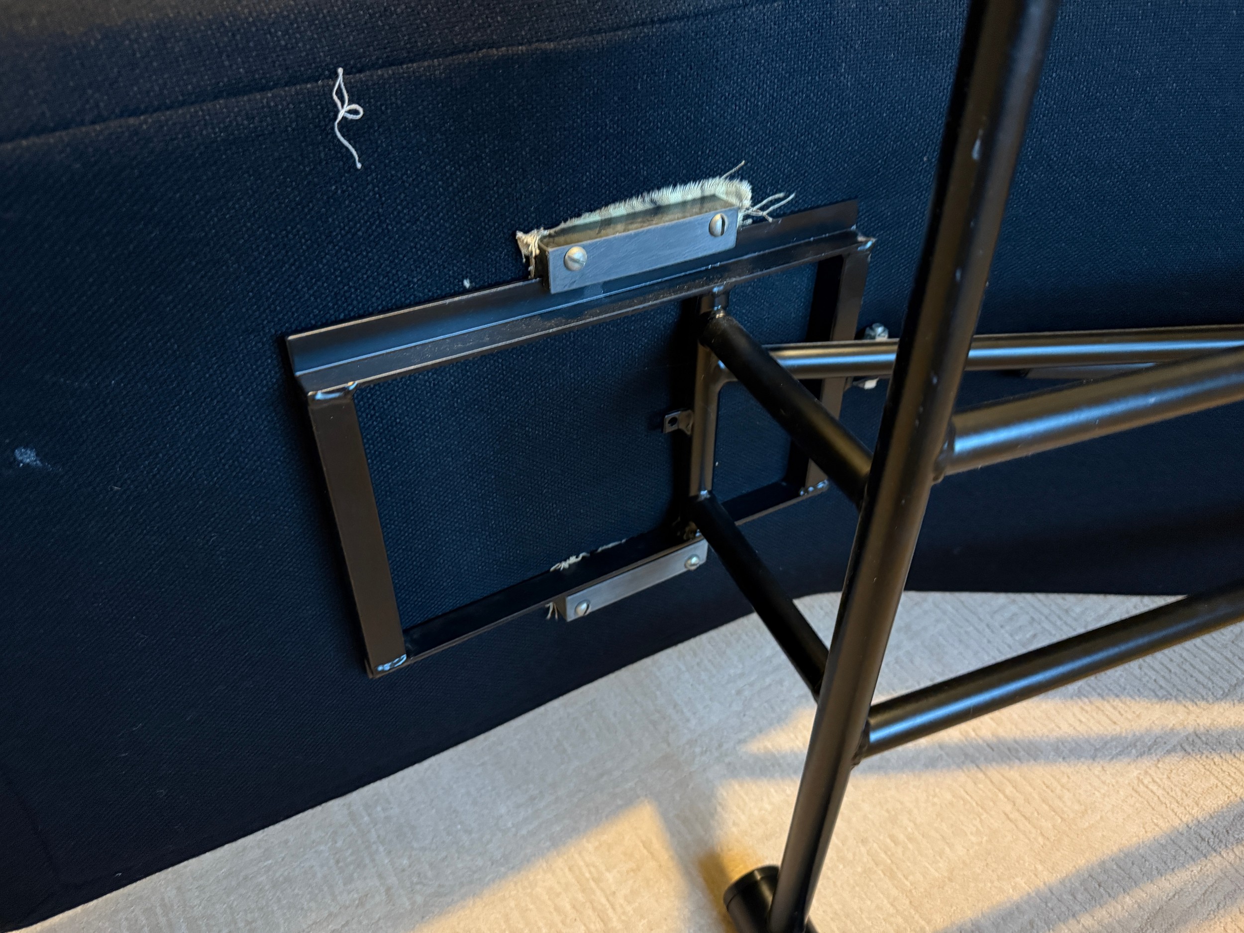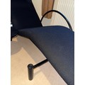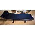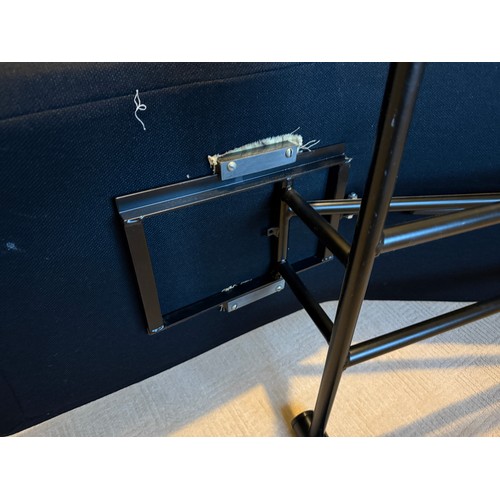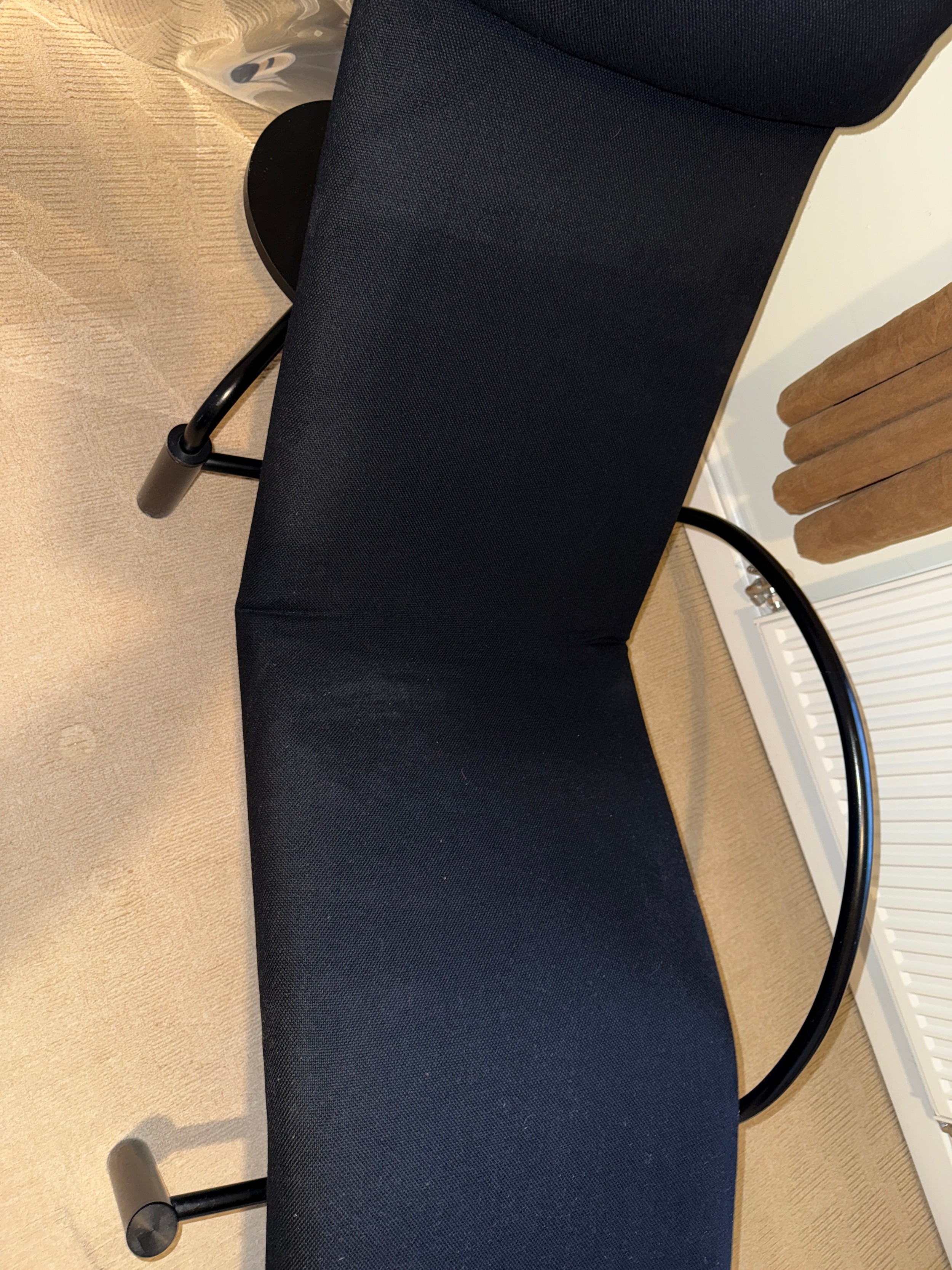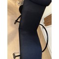 A good quality black metal and fabric covered reclining lounger with attached swivel table, in the style of Le Corbusier. Length reclined 181 x 47cm.